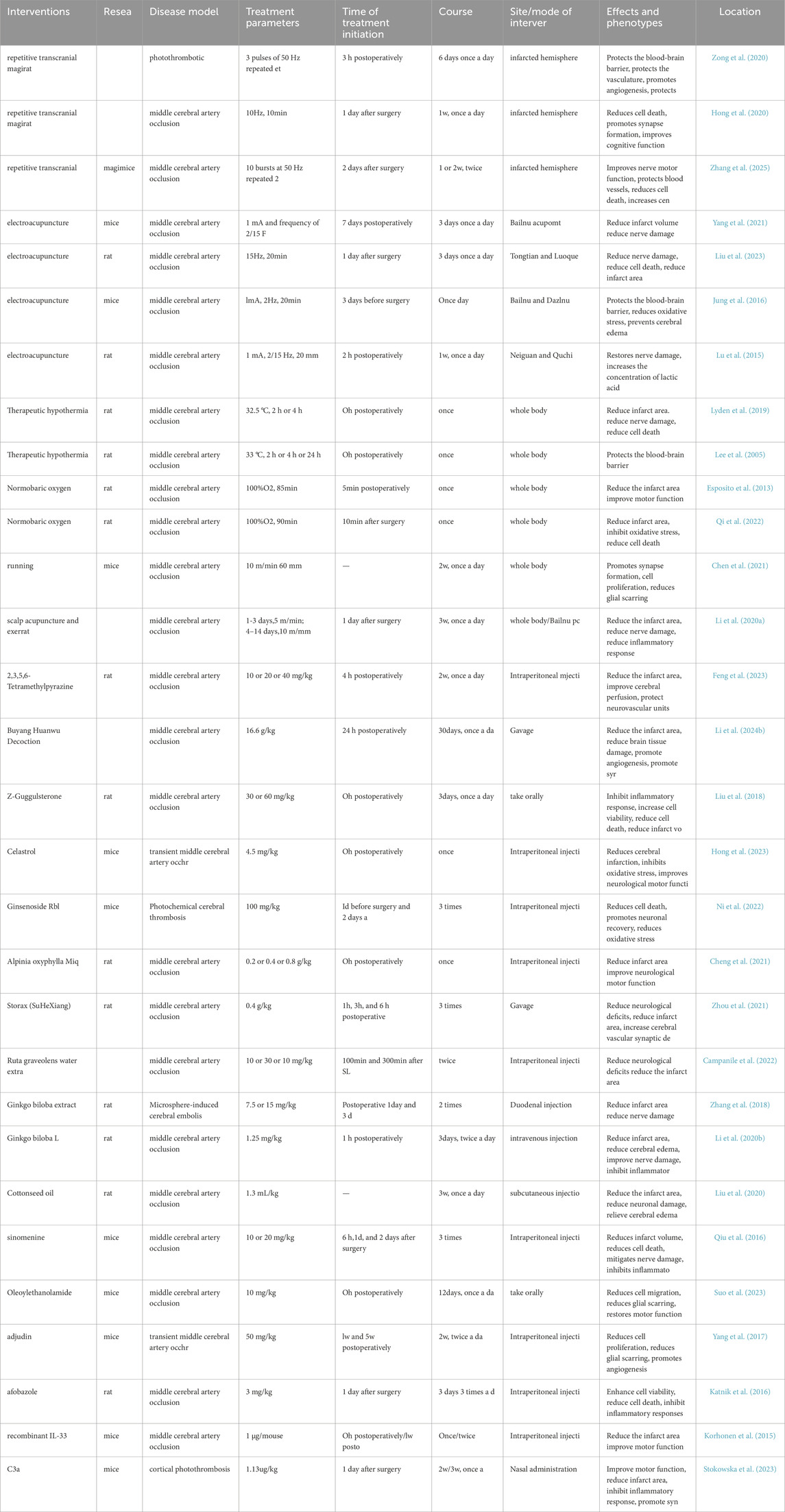 The core advantage of rehabilitative therapies resides in their capacity to simultaneously target multiple components of the neurovascular unit, thereby producing synergistic effects. Unlike invasive procedures such as craniotomy, interventions like rTMS, EA, and exercise therapy are non-invasive or minimally invasive, associated with reduced trauma and lower risk of infection (Galvin et al., 2015). Moreover, these approaches avoid the systemic burden associated with pharmacotherapies—such as hepatorenal toxicity, drug interactions, and potential adverse effects—thereby facilitating clinical translation (Tan et al., 2025). However, further optimization is still required, including standardization of stimulation parameters and treatment locations for rTMS and EA. Additionally, treatment efficacy may be influenced by patient age, stroke severity, and genetic background, underscoring the need for personalized therapeutic strategies (Hegedus et al., 2022).
