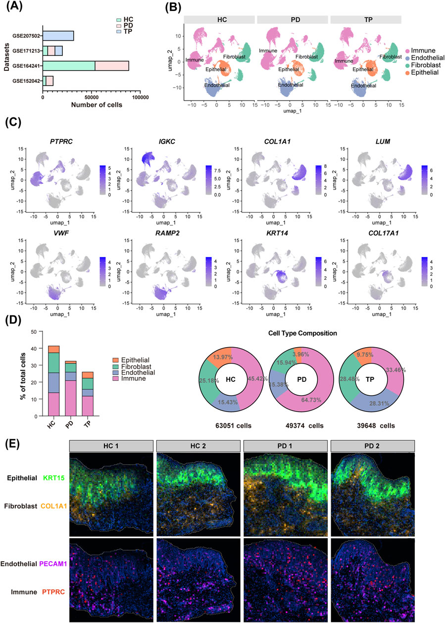 Figure 1. Gingival cellular dynamics landscape during periodontitis progression. (A) Dataset sources (y-axis) and sequenced cell count (x-axis) of gingival single-cell RNA sequencing (scRNA-seq). Groups: healthy control (HC, blue), periodontitis (PD, red), and treated periodontitis (TP, green). (B) Uniform manifold approximation and projection (UMAP) visualization of the integrated single-cell data from HC, PD, and TP groups. (C) Marker gene validation: representative transcripts defining the major cell lineages. (D) The total cell percentage for different cell types across the entire dataset (left) and the proportional composition of cell types within each group (right). (E) Spatial mapping of the gene expressions of KRT15, COL1A1, PECAM1, and PTPRC. Groups: healthy controls (HC) and periodontitis (PD).