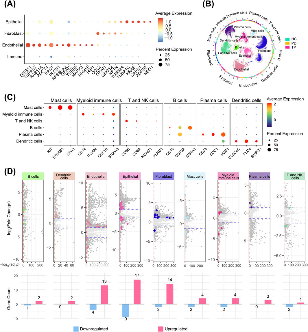 Figure 2. Gingival neurotransmitter signaling-related gene changes during periodontitis progression. (A) Cross-analysis of highly variable genes (HVGs, top 2000) and neurotransmitter signaling-related genes (Table 2) in four gingival cell types. (B) Circular UMAP plots of cell subpopulations. The outer ring and scatter plot colors indicate different cell types, while the inner ring colors represent the cell number ratio among the groups. (C) Markers used for immune cell identification, visualized with a bubble plot. (D) Volcano plots showing DEGs between the PD and HC groups for each cell type. Darker dots represent genes with a |log2-fold change| > 1 and an adjusted p-value <0.05. Colored dots represent genes from the neurotransmitter signaling-related gene sets, and the bar graphs show their counts (upregulated and downregulated in periodontitis).