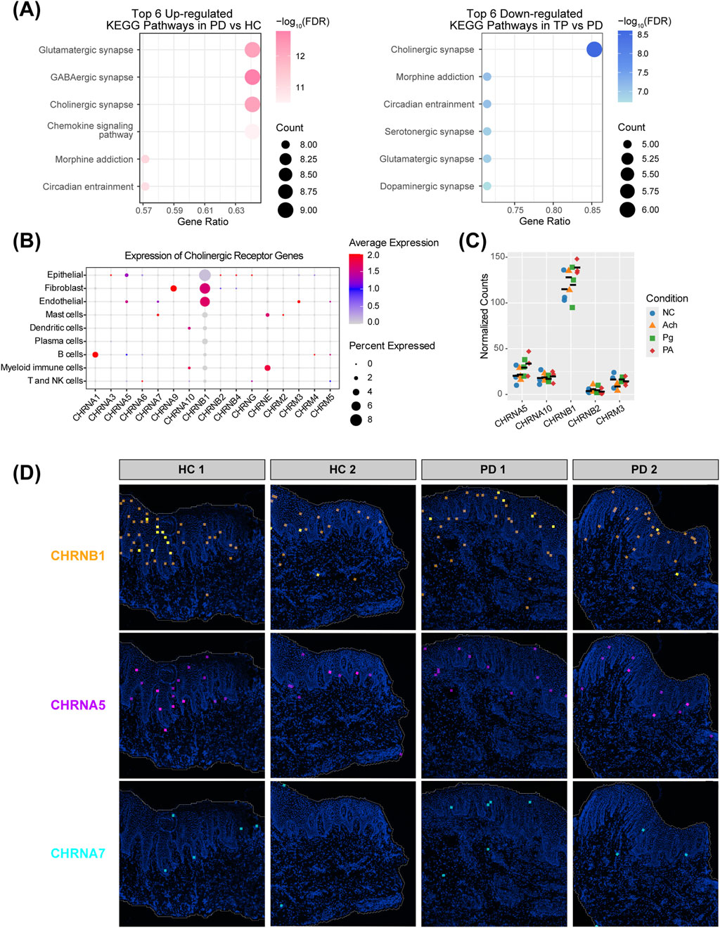 Figure 3. Acetylcholine signaling and receptor distribution in the periodontal epithelium. (A) Kyoto Encyclopedia of Genes and Genomes (KEGG) enrichment of epithelial neurotransmitter signaling-related DEGs. Left: upregulated pathways in PD vs. HC; right: downregulated pathways in TP vs. PD. (B) Expression profiles of acetylcholine receptors across different cell types. Receptors not detected in any cells were excluded. (C) Transcript counts of acetylcholine receptor genes from HOKs RNA-seq data. Five receptors detected in all 12 samples (n = 3 per group), with colored shapes representing groups and black bars indicating the mean. Receptors with low expression (zero counts in some samples) were excluded. (D) Expression of acetylcholine receptors CHRNB1, CHRNA5, and CHRNA7 in gingival spatial transcriptomics data.