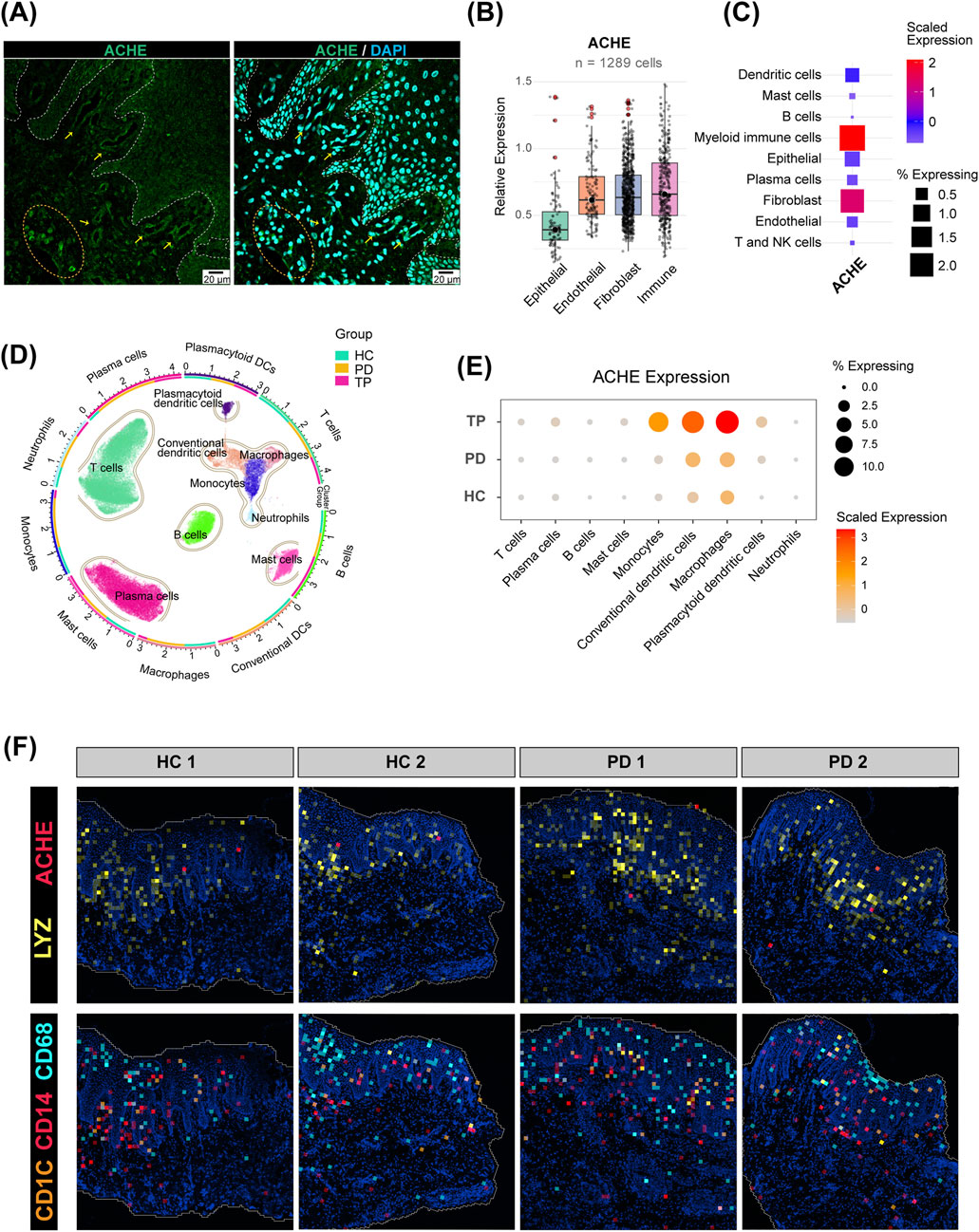 Figure 4. Expression pattern of acetylcholinesterase (AChE) in the gingiva. (A) Immunofluorescence staining of the human gingival epithelium. Cell nuclei are stained with DAPI (blue), and AChE is labeled in green (scale bar: 20 µm). The dashed line delineates the epithelial–connective tissue boundary. (B) Relative expression of AChE in the four major cell types from the scRNA-seq data. Only cells expressing AChE (expression >0) were included (n = 1,289). The center line indicates the median. (C) Expression of AChE in further refined cell subpopulations. (D) UMAP plot of isolated immune cell subpopulations. The outer ring and scatter plot colors indicate different cell types, while the inner ring colors represent the cell number ratio among the groups. (E) Expression of AChE in immune cells from the HC, PD, and TP groups. (F) Spatial distribution of AChE and myeloid immune cell marker genes in the gingiva.