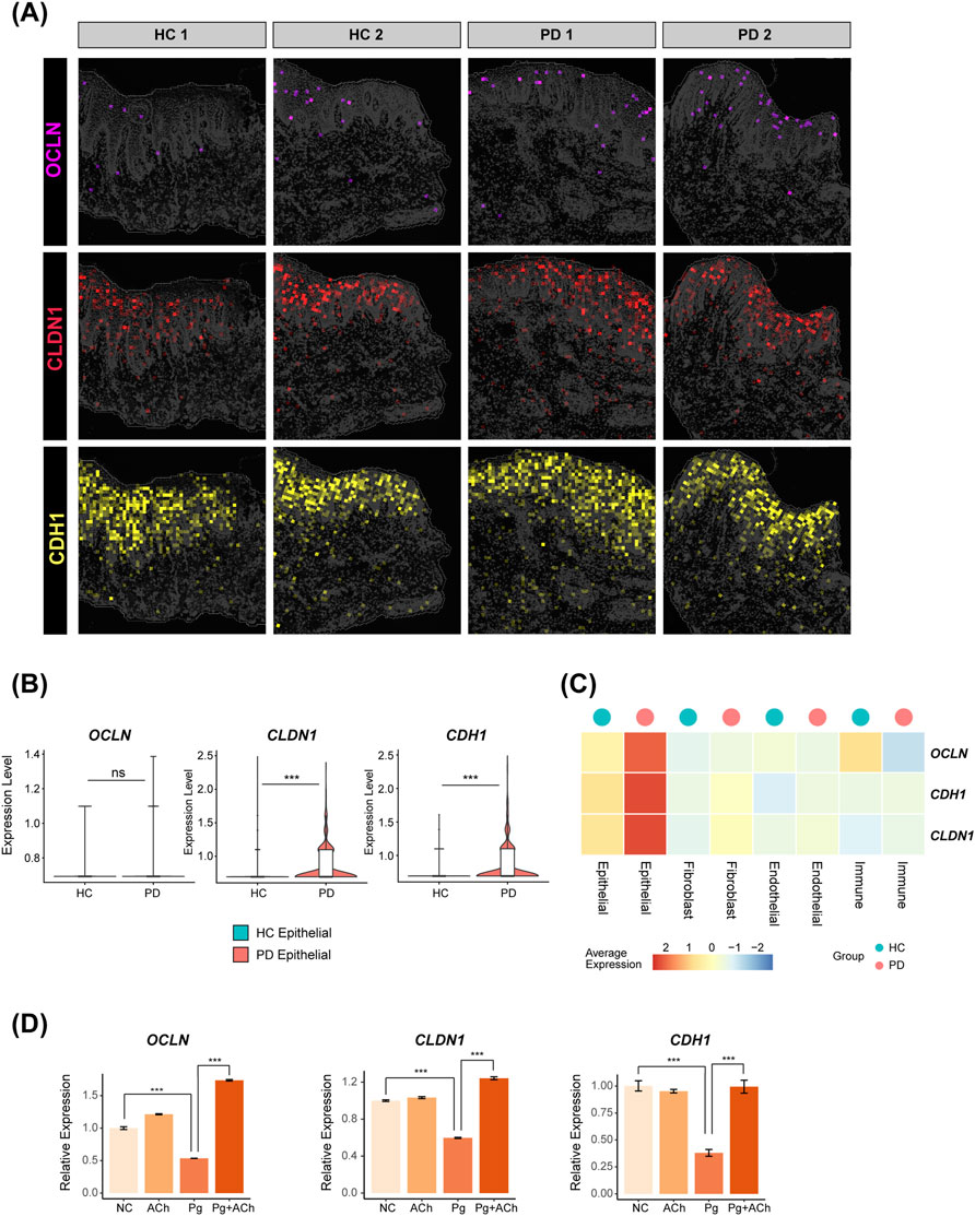 Figure 5. Distribution of tight junction genes in the periodontal gingival epithelium and their regulation by acetylcholine. (A) Expressions of OCLN, CLDN1, and CDH1 in spatial transcriptomics data. (B) Differential comparison of OCLN, CLDN1, and CDH1 in the epithelial subpopulation of HC versus PD groups (***, p < 0.001). (C) Heatmap showing the expressions of OCLN, CLDN1, and CDH1 for each cluster in HC and PD gingiva. (D) Quantitative polymerase chain reaction (qPCR) validation in HOKs. Data are presented as the mean ± standard error of the mean (SEM). ***, p < 0.001.