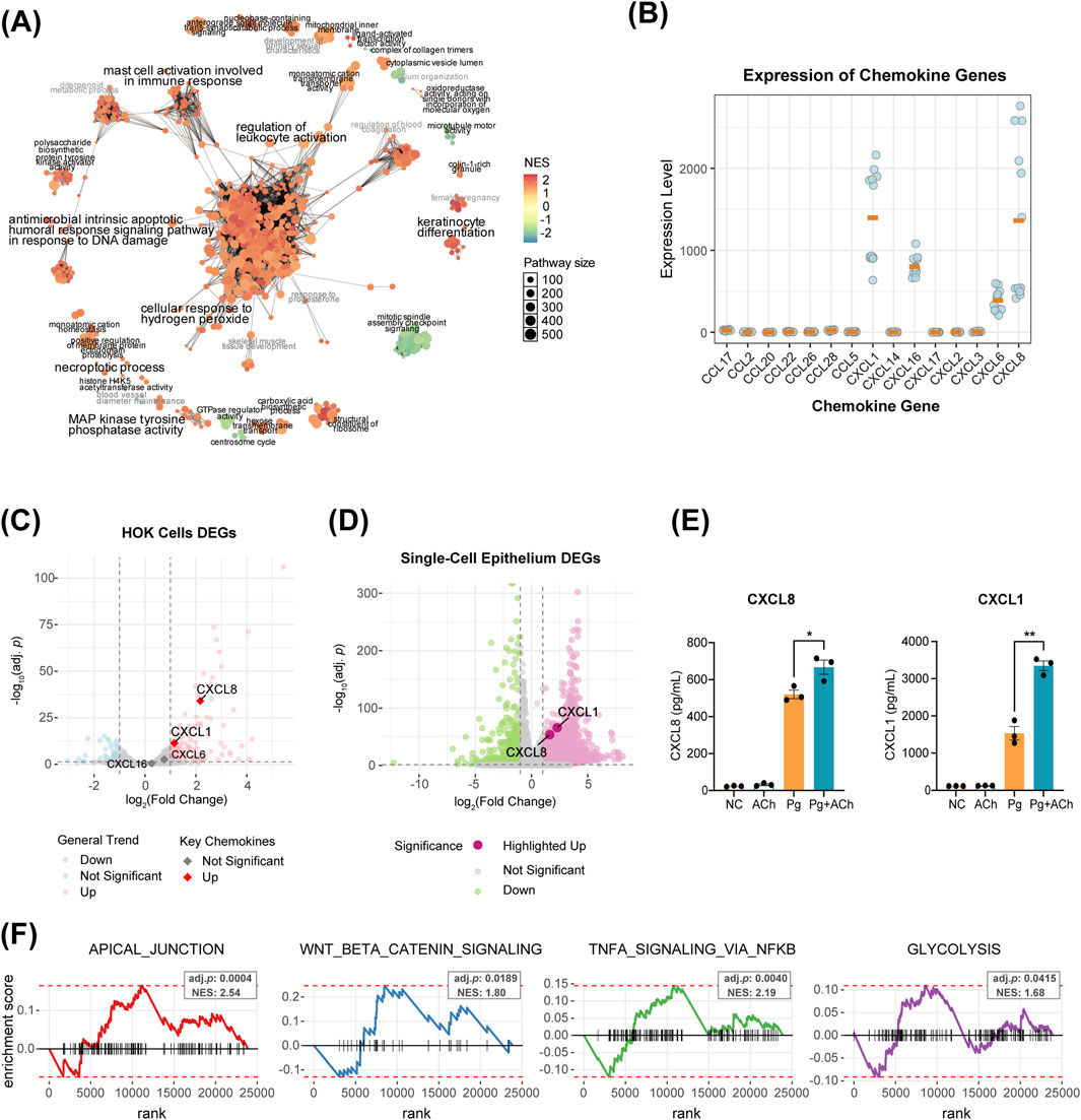 Figure 6. Acetylcholine orchestrates a multi-dimensional defense program in epithelial cells. (A) Network of GSEA-GO enrichment analysis for Pg vs. NC DEGs. Each node represents a GO term, with circle size and color indicating the pathway size and the NES score, respectively. Node-sharing clusters represent functionally related term groups. (B) Transcript counts of CXCL and CCL family genes in HOKs RNA-seq data. Only genes with non-zero counts across all 12 samples are displayed, with orange bars indicating the mean. (C) Volcano plot of DEGs in Pg vs. NC comparison. Colored dots represent significantly differential expression (|log2 fold change| > 1, adjusted p-value <0.05). (D) Volcano plot of PD vs. HC DEGs in epithelial cells from single-cell data. Colored dots represent significantly differential expression (|log2 fold change| > 1, adjusted p-value <0.05). (E) Enzyme-linked immunosorbent assay (ELISA) results of HOK supernatants for CXCL1 and CXCL8. *, p < 0.05 and **, p < 0.01. (F) Enrichment analysis of DEGs from the Pg + Ach vs. Pg groups using the fgsea function, showing four significantly enriched functional categories [adjusted p < 0.05, normalized enrichment score (NES) > 1.5].