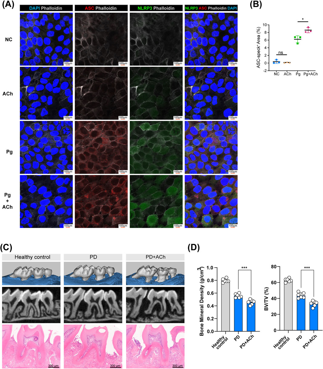 Figure 7. Acetylcholine promotes inflammasome activation and bone loss in periodontitis. (A) Representative confocal images of HOK inflammasome activation after treating with P. gingivalis (Pg), acetylcholine (ACh), or both for 24 h. ASC (red), NLRP3 (green), phalloidin (white), and DAPI (blue); scale bar: 100 µm. (B) Quantification of ASC-positive areas. *, p < 0.05; ns, no difference. (C) Micro-CT scans and H&E staining of maxillary bones from each group (control, PD, and PD + ACh). Scale bar: 300 µm. (n = 6/group) (D) Analysis of bone mineral density (BMD) and the bone volume/tissue volume (BV/TV) ratio in the second molar area from micro-CT scans, represented by individual data points (n = 6/group). ***, p < 0.001.