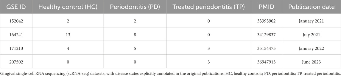 The scRNA-seq datasets comprised 205,334 cells from 40 samples across three clinical categories: 19 healthy controls (HC), 15 periodontitis patients (PD), and 6 treated periodontitis cases (TP) (Table 1; Figure 1A) (Caetano et al., 2021; Williams et al., 2021; Chen et al., 2022; Zhu and Huang, 2023). The spatial transcriptomics data included HC and PD samples with 46,230 spots at a resolution of 25 μm2 (Shen et al., 2024).