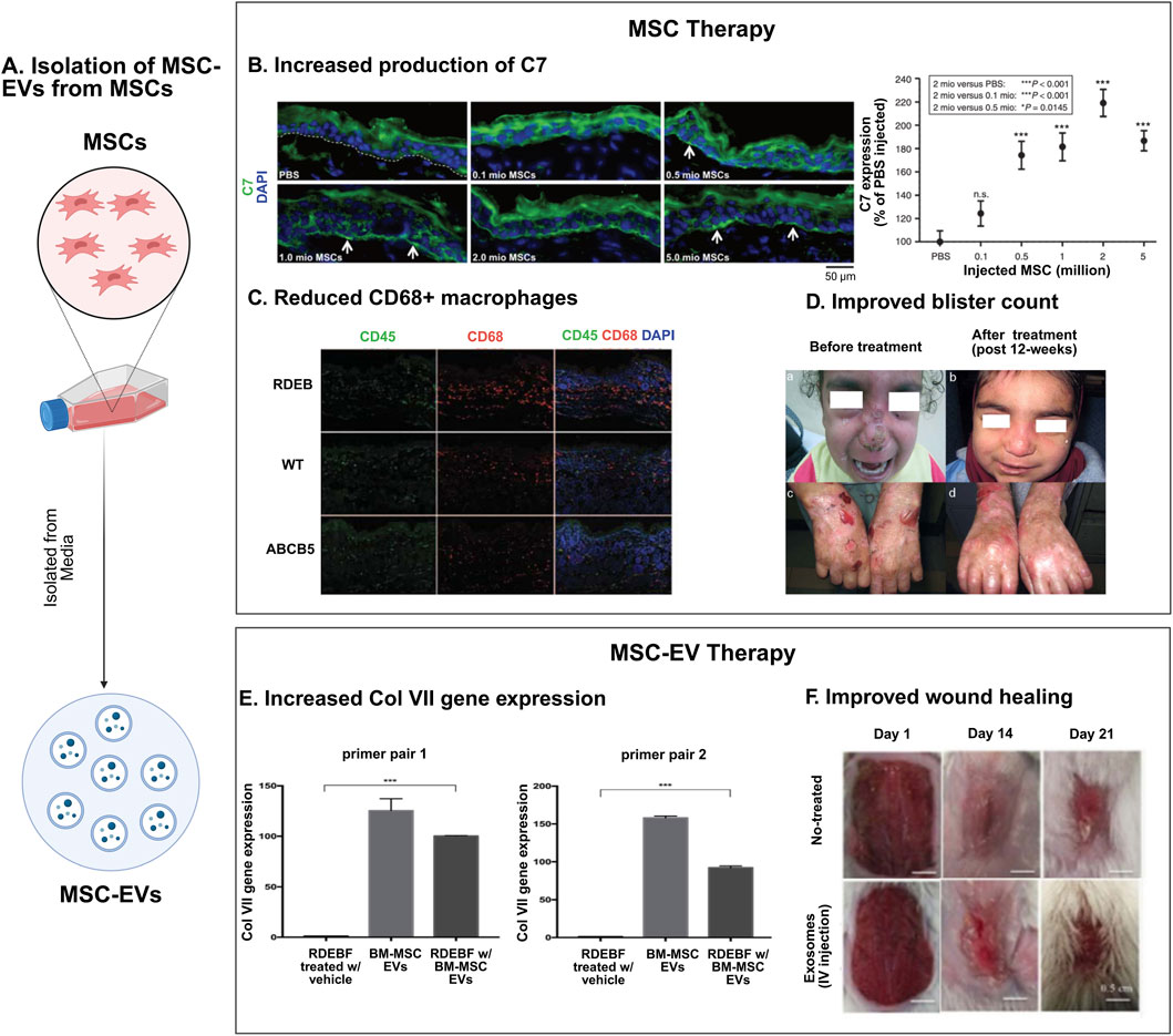 Figure 1. Mesenchymal stromal cell therapies in epidermolysis bullosa. (A) Schematic representation of MSC-extracellular vesicle (MSC-EV) isolation from MSCs. (B–D) MSC therapy for EB: MSCs are effective in treating EB, exerting several therapeutic effects, such as increasing production of type VII collagen protein (C7) (reproduced from Kühl et al., 2015) (B), showing immunosuppressive effects through a reduction in CD68+ macrophages (reproduced from Webber et al., 2017) (C), and reducing blister count in EB patients (reproduced from El-Darouti et al., 2016) (D). (E, F) MSC-EV therapy: MSC-EVs have demonstrated increased expression of collagen gene Col VII (reproduced from McBride et al., 2018) (E), and improved wound healing in murine models of EB (reproduced from Hu et al., 2016) (F).