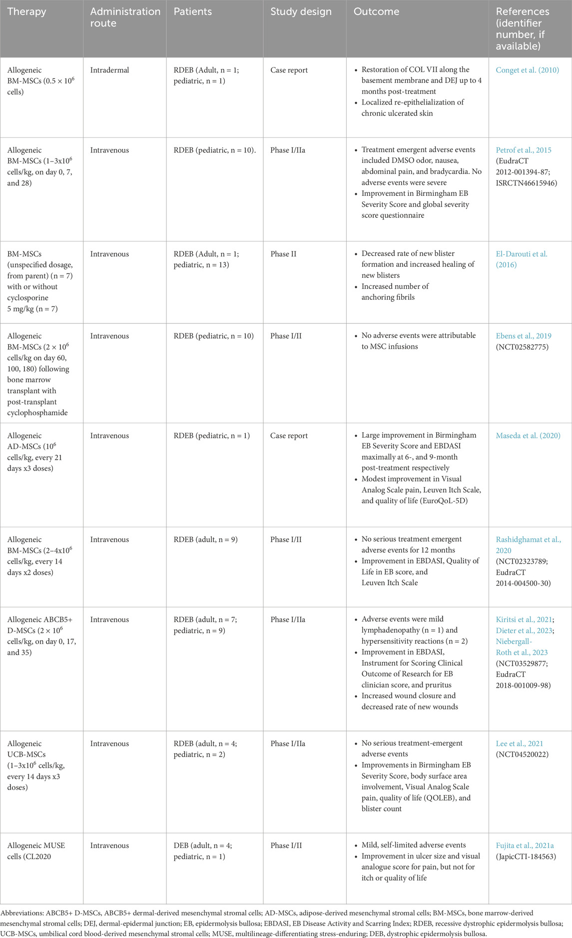 The primary literature on the use of MSCs in patients with EB is summarized in Table 1. Previous work consists mainly of preliminary data in case reports or Phase I/II trials. These studies vary widely in terms of MSC dosage, dosing schedule, route of administration, and the origin of MSCs used. However, consistent with preclinical studies, the majority of clinical research has focused on the RDEB subtype. While the earliest case report by Conget et al. employed intradermal administration of MSCs (Conget et al., 2010), later studies have shifted to intravenous administration of MSC. Given that localized administration of MSCs demonstrated localized benefit, future studies shifted to systemic delivery to see if there would be systemic effects, as EB can have multisystemic involvement. Early clinical studies also focused on BM-MSCs, with more recent studies administering AD-MSCS (Maseda et al., 2020), ABCB5+ D-MSCs (Kiritsi et al., 2021; Dieter et al., 2023; Niebergall-Roth et al., 2023), and umbilical cord blood-derived MSCs (UCB-MSCs) (Lee et al., 2021). However, omics-based functional analysis has demonstrated that the regenerative signature of MSCs is source-specific (Ganguly et al., 2023). Comparing the safety and efficacy of MSCs from different tissue origins is challenging due to variations in dosing concentrations, schedules, and clinical endpoints. To date, no head-to-head clinical trials have been conducted to directly compare MSCs from different tissue origins.