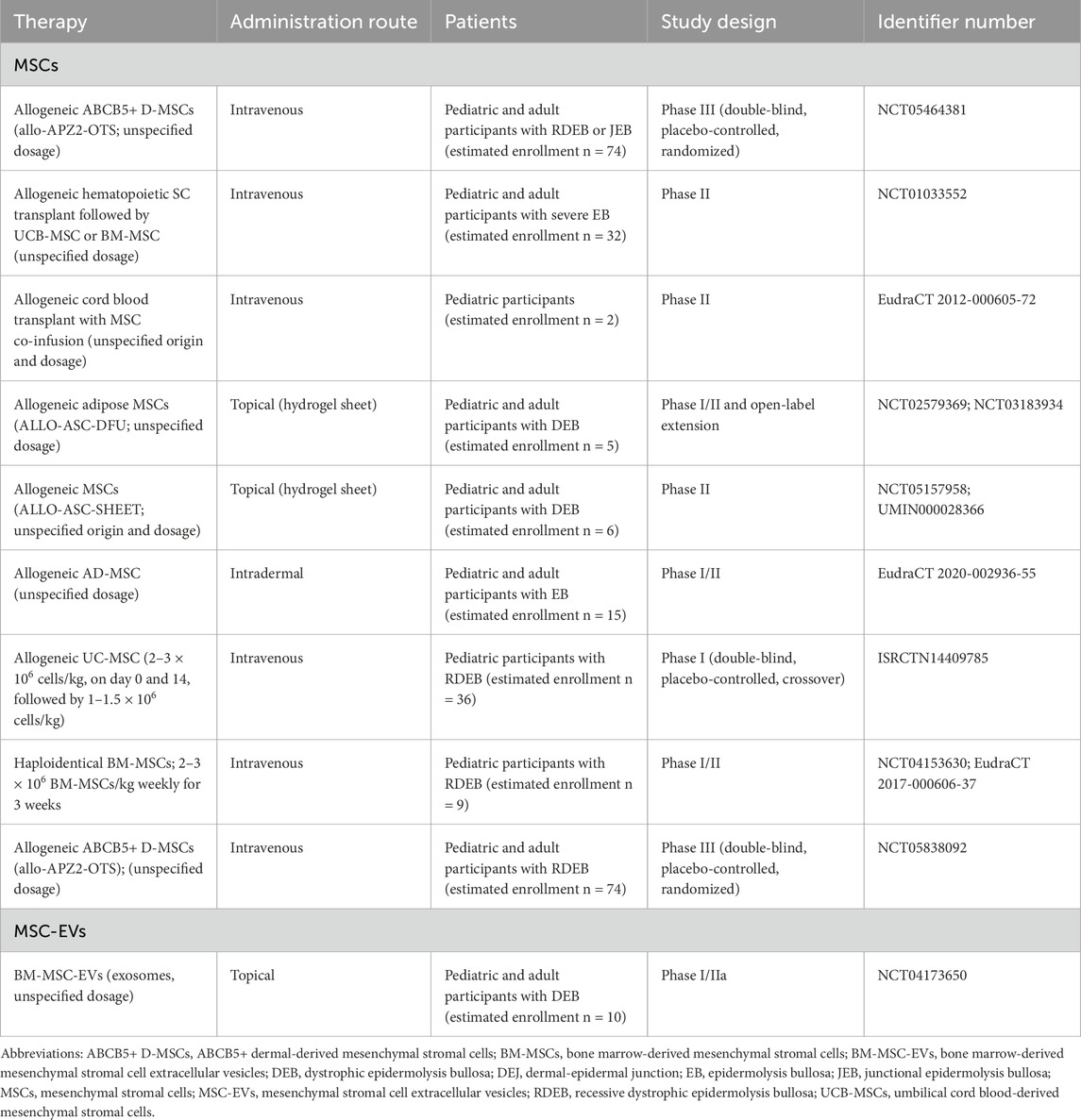 According to ClinicalTrials.gov, ongoing trials of MSCs for the treatment of EB are summarized in Table 2. While earlier clinical trials focused on RDEB, current trials are recruiting for other subtypes of EB, such as JEB and DDEB, often without requiring genotyping. Consistent with previous work, upcoming clinical trials continue to focus on ABCB5+ D-MSCs and AD-MSCs instead of BM-MSCs. ABCB5+ D-MSCs are favored for their superior skin homing capabilities, attributed to HOXA3 gene expression, and their potential to secrete C7 (Riedl et al., 2021). AD-MSCs are more abundantly accessible and are considered to offer benefits comparable to BM-MSCs, though differences in gene expression profiles, secreted factors, and disease-specific data remain notable (Strioga et al., 2012). Among these proposed clinical trials is the first double-blind, randomized, placebo-controlled trial of MSCs (NCT05464381), representing the most compelling clinical evidence to date. In addition, future clinical trials are investigating topical applications of MSCs, including the use of hydrogel sheet (NCT02579369; NCT03183934) and other topical delivery methods (NCT05157958). These trials will provide critical insights into the safety and efficacy of MSC therapies for EB subtypes beyond RDEB and evaluate the potential advantages of topical MSC delivery.