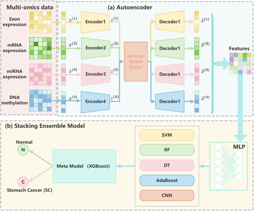 Figure 1. The overall architecture of MASE-GC, consisting of (a) modality-specific autoencoders for multi-omics feature extraction and (b) a stacking ensemble classifier with five base learners and an XGBoost meta-model for GC classification.