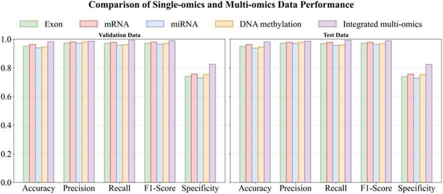 Figure 2. Comparative performance of MASE-GC on single-omics versus integrated multi-omics (bar-plot view; left: Validation, right: Test). Note: This bar chart compares the performance of MASE-GC across different omics modalities (Exon, mRNA, miRNA, DNA methylation, and Integrated multi-omics) in terms of Accuracy, Precision, Recall, F1-score, and Specificity. The performance is evaluated on both the validation (left) and test (right) splits. The integrated multi-omics model outperforms all single-omics models in all metrics.