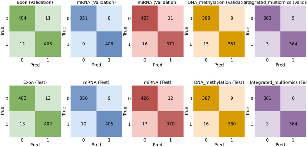 Figure 3. Confusion-matrix comparison for single-omics versus integrated multi-omics (top row: Validation; bottom row: Test). Note: This panel shows the confusion matrices for each modality (Exon, mRNA, miRNA, DNA methylation, Integrated multi-omics) on the validation (top) and test (bottom) splits. The integrated multi-omics model shows fewer false positives and false negatives compared to any single-omics model. These patterns support the higher Specificity and Recall observed in the bar charts, demonstrating the model’s stability and improved classification performance.