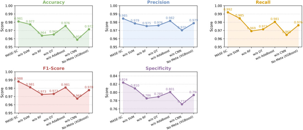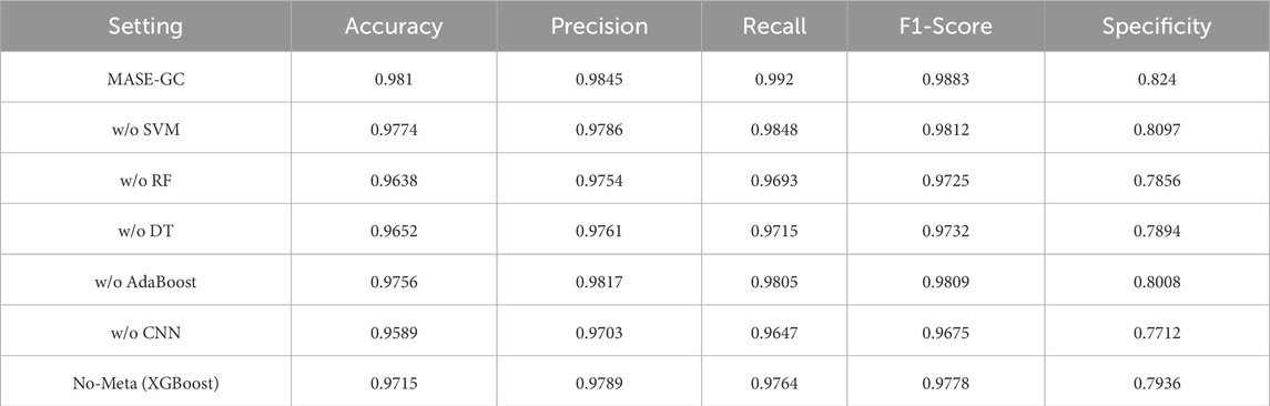 The MASE-GC model achieves Accuracy 0.981, Precision 0.9845, Recall 0.992, F1-score 0.9883, and Specificity 0.824 as shown in Table 5. Removing any component reduces performance, which confirms that the ensemble benefits from complementary strengths. The curves in Figure 4 show consistent drops across all five metrics once a learner is removed.