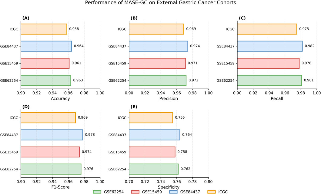 Figure 5. Performance metrics of accuracy (A), precision (B), recall (C), F1-score (D), and specificity (E)of MASE-GC across four external gastric cancer cohorts: GSE62254, GSE15459, GSE84437, and ICGC.