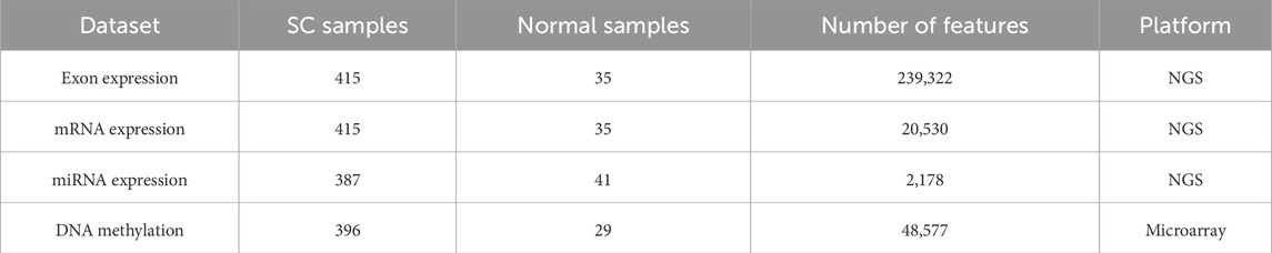 In this study, we collected four types of omics profiles from the TCGA stomach adenocarcinoma (TCGA-STAD) cohort: exon expression, mRNA expression, mature miRNA expression, and DNA methylation (Zhang et al., 2014). All datasets were retrieved from the UCSC Xena repository (https://xenabrowser.net/datapages/). Exon and mRNA expression profiles were generated using the Illumina HiSeq 2000 sequencing platform, with exon data quantified as RPKM (Reads Per Kilobase per Million mapped reads) (Mortazavi et al., 2008). DNA methylation was measured using the Illumina Infinium HumanMethylation450 array and expressed as beta values, while mature miRNA levels were obtained through Illumina HiSeq small RNA sequencing (Bibikova et al., 2011). The sample distribution and feature dimensions of the original datasets are summarized in Table 1.