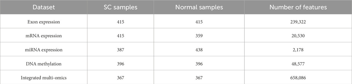 As shown in Table 2, the raw datasets exhibited a severe imbalance between SC and normal samples. To mitigate bias introduced by this imbalance, we applied a hybrid resampling strategy combining SMOTE with Tomek link undersampling (Chawla et al., 2002; Jia et al., 2021; Batista et al., 2004). SMOTE was employed to generate synthetic instances of the minority class (normal tissue samples), while Tomek links were used to eliminate ambiguous samples lying near class boundaries, thereby reducing noise and overlap. This approach not only improved class distribution but also provided a cleaner dataset for model training. Following preprocessing, feature filtering, and sample alignment across multiple omics layers, the resampled balanced dataset is summarized in Table 2, which includes the integrated multi-omics dataset with matched SC and normal cohorts.