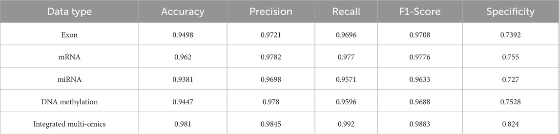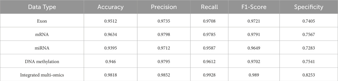 On the validation split the integrated model reaches Accuracy 0.9818, Precision 0.9852, Recall 0.9928, F1-score 0.9890, and Specificity 0.8253. On the test split it obtains Accuracy 0.9810, Precision 0.9845, Recall 0.9920, F1-score 0.9883, and Specificity 0.8240. These results are higher than any single-omics model. Compared with the strongest single layer, mRNA, the validation improvements are 1.84 percentage points in Accuracy, 0.54 in Precision, 1.43 in Recall, 0.99 in F1-score, and 6.86 in Specificity. On the test split the gains are 1.90, 0.63, 1.50, 1.07, and 6.90 percentage points respectively. The largest margins occur in Specificity, which indicates stronger control of false positives on normal tissue when heterogeneous signals are fused.