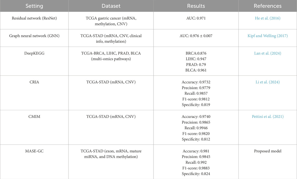 The experimental results strongly support the contributions of MASE-GC. Comparative evaluations (Tables 3, 4; Figures 2, 3) show that the integrated multi-omics framework significantly outperforms single-omics models. Among individual layers, mRNA achieved the strongest results, yet the integration of all four modalities led to notable performance gains, particularly in specificity. The ability to reduce false positives while maintaining high recall underscores the effectiveness of multi-omics fusion in capturing complementary biological signals.