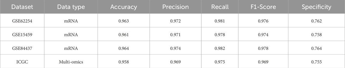 By contrast, MASE-GC achieved an Accuracy of 0.981, Precision of 0.9845, Recall of 0.992, F1-score of 0.9883, and Specificity of 0.824 on TCGA-STAD. As shown in Figure 5, the performance of MASE-GC on external gastric cancer cohorts, including GSE62254, GSE15459, GSE84437, and ICGC, demonstrates robust accuracy across all datasets, with specific improvements in recall and specificity. These results demonstrate that MASE-GC not only surpasses ResNet and GNN in overall predictive performance but also provides a more balanced outcome compared with CRIA and CMIM. The model delivers improvements in Recall and F1-score while maintaining the highest Specificity, which indicates stronger capability in correctly identifying normal samples.