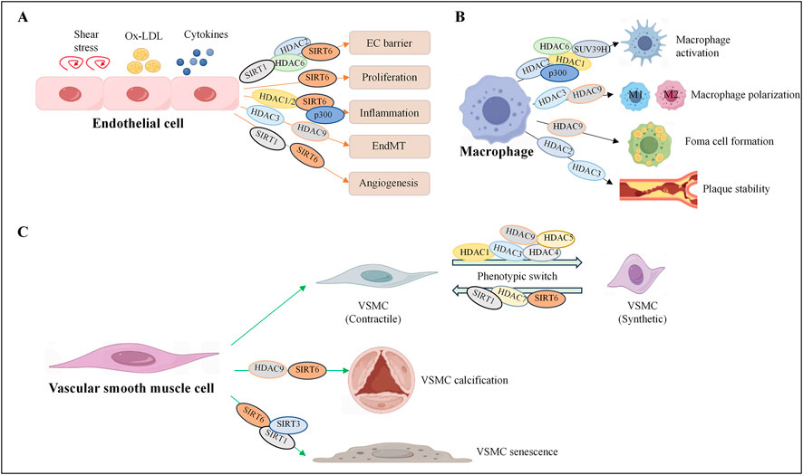 Damage to the arterial intima induced by various risk factors and endothelial dysfunction is recognized as a critical initiating event in the development of atherosclerosis. Under physiological conditions, endothelial cells (ECs) maintain vascular homeostasis by producing vasodilator and vasoconstrictor molecules, such as endothelin and nitric oxide (NO), to regulate vascular tone, facilitate vascular repair and preserve endothelial barrier integrity. However, exposure to cardiovascular risk factors alters endothelial permeability and triggers ECs to express adhesion molecules and chemokines, which exacerbates cholesterol-laden low-density lipoprotein (LDL) infiltration and leukocyte rolling and adhesion to the intima (Xu et al., 2021b). The accumulation of oxidized low-density lipoprotein (ox-LDL) in the arterial intima aggravates endothelial inflammation and further induces histone modifications. Studies have shown that HDAC2 protects against endothelial dysfunction induced by ox-LDL and that the number of atherosclerotic plaques in mice overexpressing HDAC2 is significantly reduced. Further investigations revealed that ox-LDL inhibits HDAC2 expression in endothelial cells, promoting acetylation of arginase 2 (Arg2), which in turn reduces NO production and impairs endothelial function (Pandey et al., 2014; Hori et al., 2020). HDAC1 and HDAC2 cooperatively repress VCAM-1 expression by inhibiting the acetylation of STAT3 at lysine 685 and reducing the methylation of the GATA6 promoter, which alleviates atherosclerotic lesion formation (Hu et al., 2021). Histone deacetylases are closely related to endothelial‒mesenchymal transition (EndMT), which is a key factor in stabilizing atherosclerotic plaques. Studies have revealed that HDAC3 expression is upregulated in the aortas of atherosclerotic mice and human umbilical vein endothelial cells (HUVECs) stimulated with tumor necrosis factor-α (TNF-α) or interleukin-1β (IL-1β). HDAC3 inhibition via siRNA or the specific inhibitor RGFP966 suppresses EndMT and inflammation in TNF-α/IL-1β-stimulated HUVECs (Chen et al., 2021). Subsequent studies have shown that HDAC3 influences the differentiation of endothelial progenitor cells and that the overexpression of HDAC3 leads to increased Akt phosphorylation and kinase activity, thereby promoting plaque formation and vascular rupture in ApoE−/− mice (Zampetaki et al., 2010). Additionally, HDAC3 protects against atherosclerosis by inhibiting inflammation by inactivating NF-κB/p65 through the upregulation of miR-19b-mediated PPARγ in ox-LDL-treated HUVECs (Wang et al., 2021c). These findings demonstrated that HDAC3 serves as an essential pro-survival molecule with a critical role in maintaining endothelial integrity. Among the Class II histone deacetylases, HDAC4 expression and phosphorylation are markedly upregulated after stroke, and suppression of HDAC4 phosphorylation inhibits tube formation and the expression of genes downstream of HIF-VEGF signaling in an endothelial cell hypoxia model (Liu et al., 2017). A recent study revealed that HDAC6 is recruited to the VEGF gene promoter in ox-LDL-treated HUVECs, enhancing H3K9 deacetylation and vascular endothelial cell injury (Kai et al., 2021). Similar studies have shown that endothelial HDAC6 expression and activity are upregulated, whereas cystathionine γ-lyase (CSEγ) mRNA expression and protein abundance are reduced in ox-LDL-exposed HAECs, thereby reducing the production of H2S and impairing cardiovascular homeostasis (Leucker et al., 2017). Additionally, endothelium-specific HDAC9 knockout in mice significantly suppressed EndMT and reduced atherosclerotic plaque formation. Furthermore, these mice presented a more favorable plaque phenotype, with decreased plaque lipid content and increased fibrous cap thickness (Lecce et al., 2021). Mattagajasingh et al. reported that SIRT1 preserves EC function by targeting the calmodulin-binding domain of nitric oxide synthase (eNOS) at lysines 496 and 506, increasing eNOS activity and NO bioavailability (Mattagajasingh et al., 2007). One study revealed that SIRT1 is poorly expressed in AS and that LincRNA-p21 competitively binds to miR-221, inducing the SIRT1-mediated deacetylation of Pcsk9, which promotes endothelial cell tube formation and inhibits the development of AS (Wang et al., 2021a). Studies have shown that SIRT6 suppresses EC pyroptosis by deacetylating apoptosis-associated speck-like protein (ASC), thus inhibiting its interaction with NLRP3 and preventing the progression of AS (Huang et al., 2024). Moreover, SIRT6 also activates the MAPK signaling pathway, promoting apoptosis and suppressing proliferation in ox-LDL-induced HUVECs (Xu et al., 2021c). Although SIRT6 has been reported to be a molecule with anti-atherosclerotic effects, studies have also revealed that SIRT6 has a condition-dependent effect and plays different roles in the functions of HUVECs. Under hypoxic conditions, SIRT6 promotes plaque angiogenesis by activating HIF-1α, whereas under oxidative stress conditions, it binds to the promoter of catalase and reduces H3K56 acetylation, leading to reactive oxygen species (ROS) production and exacerbating neovascular injury (Yang et al., 2021). The HAT p300 exerts dual effects on endothelial cells in atherosclerosis that change with the environment. On the one hand, ox-LDL induces p300-mediated acetylation of the IL-8 and MCP-1 promoters, thereby increasing chemokine expression and leukocyte recruitment (Dje N'Guessan et al., 2009). On the other hand, p300 promotes H3K27 acetylation at the SOCS1 promoter, increasing the transcription of SOCS1 and inhibiting JAK/STAT signaling to reduce endothelial cell damage and mitochondrial dysfunction (Xue and Deng, 2024).