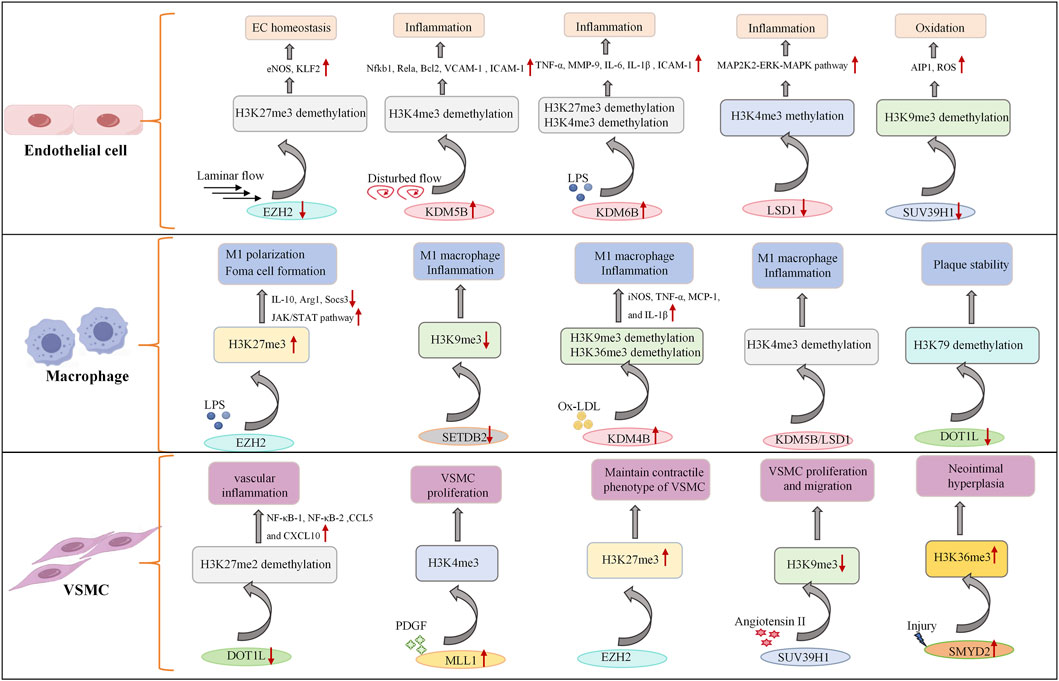 Figure 2. Role of histone methyltransferases and demethylases in endothelial cells, macrophages, and vascular smooth muscle cells. Under the combined influence of cytokines, oxidized low-density lipoproteins and blood flow, the expression of histone methyltransferases and demethylases in vascular cells is regulated, which in turn affects the methylation level of histones within the cells and activates multiple signaling pathways, such as the NF-κB signaling pathway, ERK-MAPK signaling pathway and JAK/STAT signaling pathway, to regulate gene expression and cellular dysfunction. EZH2, enhancer of zeste homolog, histone methyltransferase; KDMs, lysine demethylases; SUV39H1, histone lysine methyltransferase; DOT1L, histone methyltransferase; ↑ indicates upregulation; ↓ indicates inhibition.