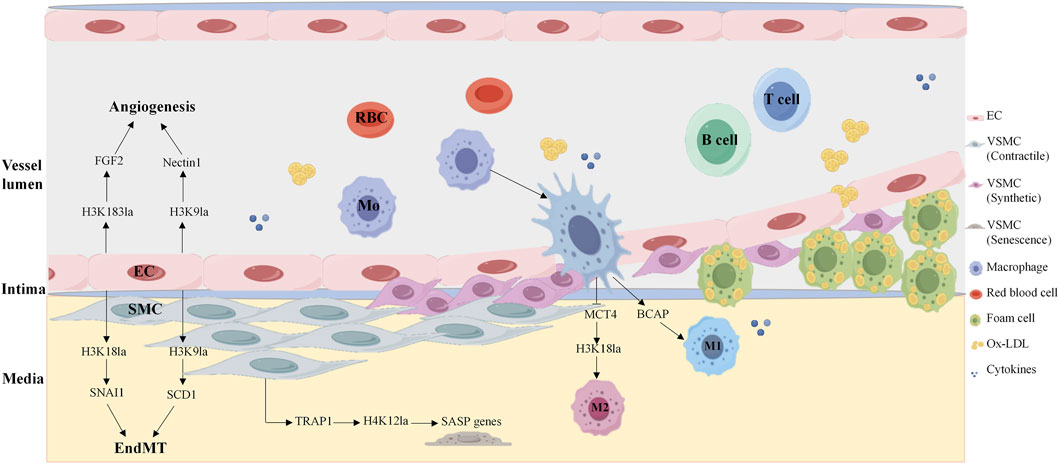Endothelial cells rely on dynamic metabolic reprogramming to adapt to atherogenic microenvironments, with histone lactylation serving as a critical link between EC metabolism and pathological phenotypes. A study revealed that 77 of 67 proteins presented increased lactylation in the context of increased lactate under hypoxia. The protein Yin Yang-1 (YY1), a transcription factor, is lactylated at lysine 183 (H3K183la), which is regulated by p300. Hyperlactylated YY1 directly binds the promoter of fibroblast growth factor 2 (FGF2), enhancing its transcription and promoting angiogenesis, whereas administration of the p300 inhibitor A485 abrogates YY1 lactylation and suppresses vascularization in vitro and in vivo, highlighting the therapeutic potential of targeting this axis (Wang et al., 2023). Similar studies have also revealed that a feedback loop between H3K9 lactylation (H3K9la) and HDAC2 in endothelial cells drives VEGF-induced angiogenesis. H3K9la levels are increased in endothelial cells in response to VEGF stimulation and are enriched in the promoter regions of angiogenic genes, such as Nectin1 and Tgfbr2, which activate their transcription to drive angiogenesis. Notably, hyperlactylation of H3K9la inhibits the expression of HDAC2, whereas HDAC2 overexpression reduces H3K9la levels and suppresses the migration, proliferation and tube formation of ECs. Disrupting this loop represents a novel strategy to treat pathological neovascularization (Fan et al., 2024). Further research revealed that lactate induces H3K9 and H3K18 lactylation at the PRMT5 promotor and promotes its expression in neovascular endothelial cells. Mechanistically, SEMA6A recruits RhoA and p300, facilitating p300 phosphorylation and the histone lactylation cycle, thereby inhibiting angiogenesis (Ma et al., 2025b). Histone lactylation also plays an important role in the regulation of EndMT. Research has shown that under ox-LDL stimulation, the histone chaperone ASF1A and histone acetylase P300 together enhance histone H3K18 lactylation, which increases the expression of SNAI1, inducing EndMT and promoting atherosclerosis (Dong et al., 2024). P300 also cooperates with ACSS1 to catalyze H3K9la and transcriptionally activates SCD1, which exacerbates endothelial dysfunction and atherosclerosis (Ma et al., 2025a). These findings reveal a novel mechanism by which energy metabolism and epigenetics regulate atherosclerosis via endothelial cell reprogramming, in which histone lactylation plays a central role. Recent study has shown that protein lactoylation drives EndMT and plaque instability. The lactate transporter aquaporin 9 (AQP9) enhances DRP1-mediated mitochondrial fission via lactate and promotes vimentin and N-cadherin expression while inhibiting VE-cadherin expression, thereby driving endothelial cell mesenchymal transformation and ultimately exacerbating vulnerable carotid plaque formation (Xu et al., 2025). A recent study revealed that IGFBP5 promotes NLRP3 inflammasome-induced EndMT by regulating glycolysis-mediated histone lactylation, accelerating the progression of diabetic nephropathy (Hu et al., 2025).