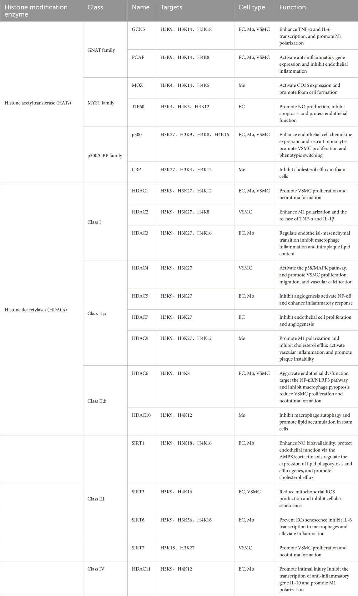 Histone acetylation is the most extensively studied epigenetic modification in the occurrence and development of cardiovascular disease. The enzymes governing histone acetylation are broadly categorized into histone acetyltransferases (HATs), which add acetyl groups, and histone deacetylases (HDACs), which remove them. Acetylation weakens histone‒DNA interactions and loosens the chromatin structure, allowing transcription factors to bind and promote gene expression, whereas deacetylation restores the positive charge of histones and strengthens histone‒DNA binding, leading to chromatin condensation and transcription suppression (Lee et al., 1993). Thus, the dynamic balance between histone acetylation and deacetylation, orchestrated by two opposing enzyme families, serves as a core regulatory switch for controlling gene transcription. HATs are classified into three major families on the basis of their structural and functional characteristics: the GCN5-related N-acetyltransferase family (HAT1, GCN5 and PCAF), the MYST family (MOZ, MORF, HBO1 and TIP60), and the p300/CBP family, which includes p300 and CBP (CREB-binding protein). HDACs are classified into four classes on the basis of their structure and function: Class I HDACs (HDAC1, 2, 3, 8), Class II HDACs, which are subdivided into IIa (HDAC4, 5, 7, 9) and IIb (HDAC6, 10), Class III HDACs (SIRT1-7), and Class IV HDACs, which constitute a small class consisting of only HDAC11 (Park and Kim, 2020). This dynamic regulation of histone acetylation status directly dictates the transcriptional activity of genes controlling inflammation, lipid metabolism, and cell proliferation in vascular cells, thereby establishing histone acetylation/deacetylation as a central epigenetic axis in atherosclerotic pathogenesis (Table 1 for a summary of the HAT/HDAC families involved in atherosclerosis). We illustrate the histone acetylation mechanisms underlying vascular cells (Figure 1).