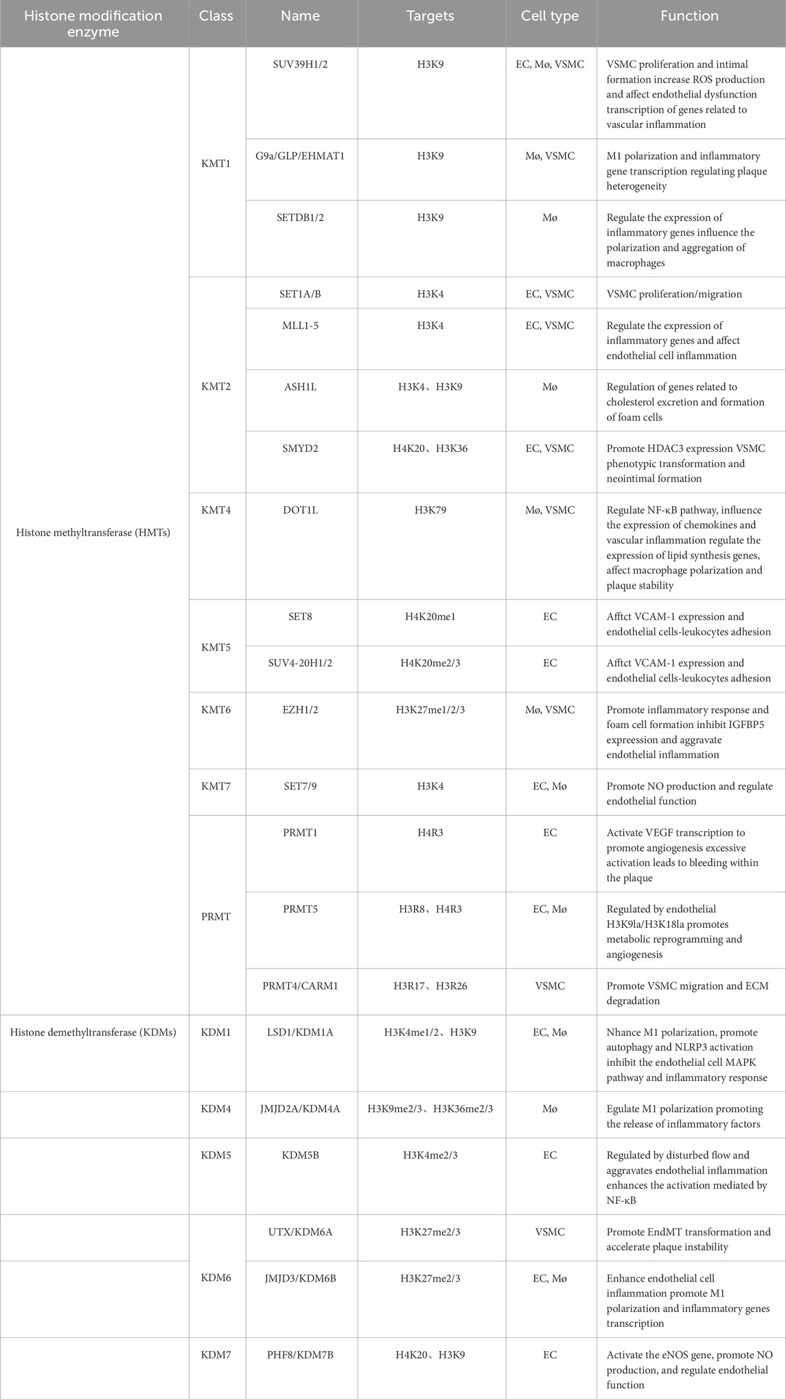 Compared with histone acetylation, histone methylation is a more stable epigenetic modification that mainly occurs on lysine (k) or arginine (R) residues of histones H3 and H4. The number of methyl groups added can be divided into mono-methylation (me1), di-methylation (me2), and tri-methylation (me3) groups. The biological effects of histone methylation are complex and depend on the specific residues being modified and the degree of methylation (Zhang et al., 2023a). For example, common methylation sites include H3K4, H3K9, H3K27, H3K36, H3K79 and H4K20. Among them, H3K4me1/2/3, H3K9me1, H3K27me1, H3K36me1/2/3 and H3K79me1/2/3 are usually associated with transcriptional activation, whereas H3K9me3, H3K27me3 and H4K20me2/3 are typical inhibitory marks (Greer and Shi, 2012). The process is dynamically regulated by histone lysine methyltransferases (HKMTs) and histone lysine demethylases (KDMs). Histone methyltransferases include six families of histone lysine methyltransferases (HKMT1-6) and four histone arginine/methionine methyltransferases (PRMT1, 3, 5, 6 and CARM1). Histone demethylases can be roughly categorized into three major classes: lysine-specific demethylases (LSD1 and LSD 2), JmjC domain-containing demethylases (KDM2-6), and PHD finger-containing demethylases (KDM7 and KDM8). By modulating chromatin conformation and DNA accessibility, histone de/methylation controls the transcription of genes involved in vascular cell function, making it a key epigenetic regulator of atherosclerotic initiation and progression (Table 2 for a summary of histone de/methyltransferases in atherosclerosis).