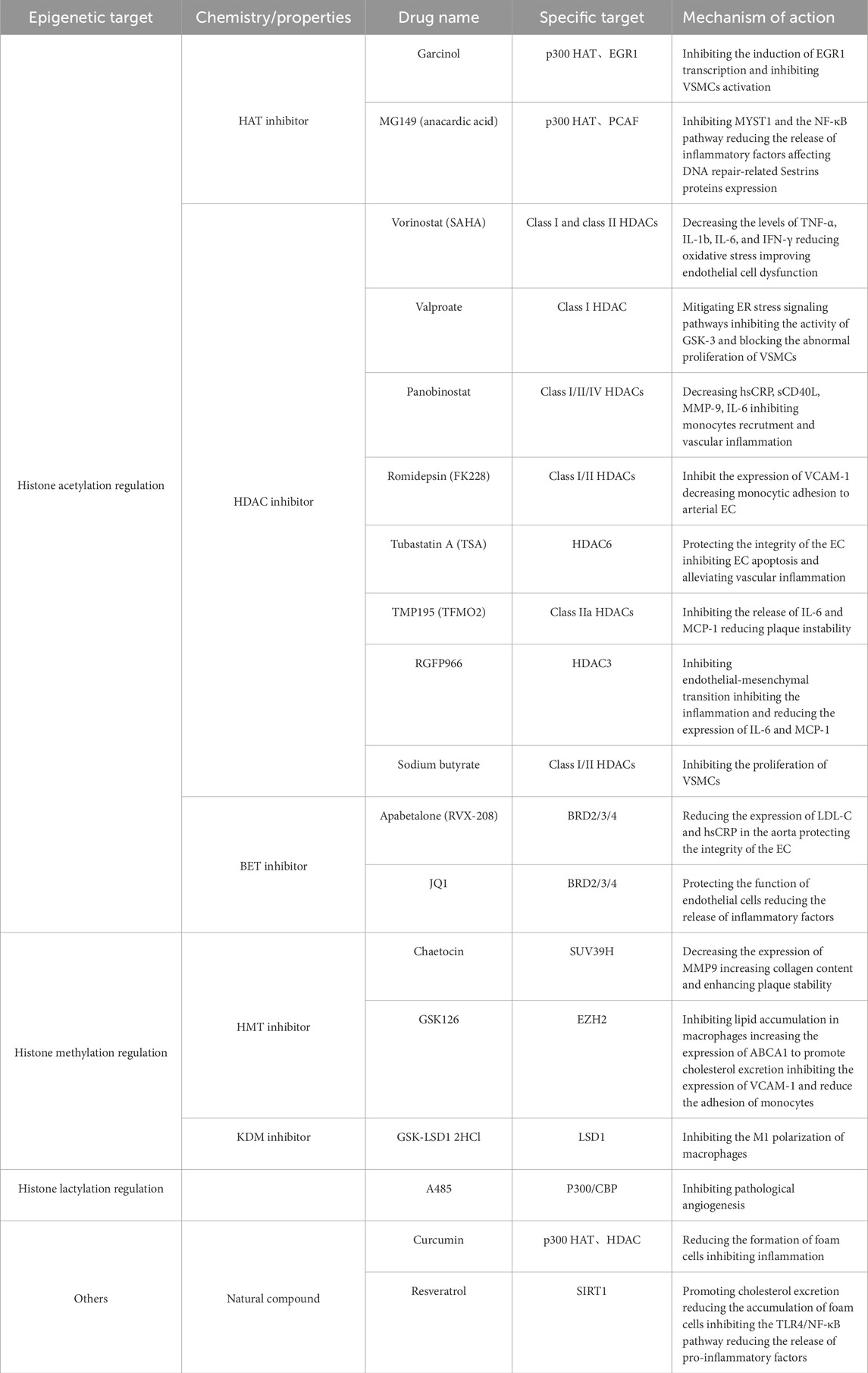 Histone methylation is often associated with transcriptional repression, and histone methyltransferase inhibitors (HMTi) such as temsirolimus, have demonstrated clinical efficacy in anti-tumor therapy by inhibiting aberrant histone methylation and regulating gene expression (Marzochi et al., 2023). Compared with other epigenetic inhibitors, HMTi has been studied less extensively in cardiovascular disease. Recent evidence indicates that the H3K27me3 methyltransferase EZH2 is involved in autoimmune inflammation and that targeting H3K9me2/3 and H3K27me3 may serve as an effective strategy for treating chronic inflammatory diseases (Zhang et al., 2018). GSK126 is a potent and highly selective EZH2 inhibitor that exerts anti-inflammatory and protective effects on psoriatic arthritis. In advanced atherosclerotic plaques, IGFBP5 expression is significantly downregulated due to epigenetic silencing by H3K27me3, and GSK126 can upregulate IGFBP5 to trigger anti-inflammatory responses, thereby inhibiting monocyte adhesion to ECs (Xu et al., 2018). Additionally, GSK126 not only suppresses H3K27me3 modification but also significantly reduces pro-inflammatory gene expression at both the mRNA and protein levels. Similar studies have shown that GSK126 effectively retards atherosclerosis progression by reducing macrophage foam cell formation and monocyte adhesion (Wei et al., 2021). In addition to GSK126, targeted therapies against SUV39H1 and DOT1L may also help delay atherosclerosis progression (Willemsen et al., 2022; Yang et al., 2025b), and multiple EZH2 inhibitors are currently in clinical trials.