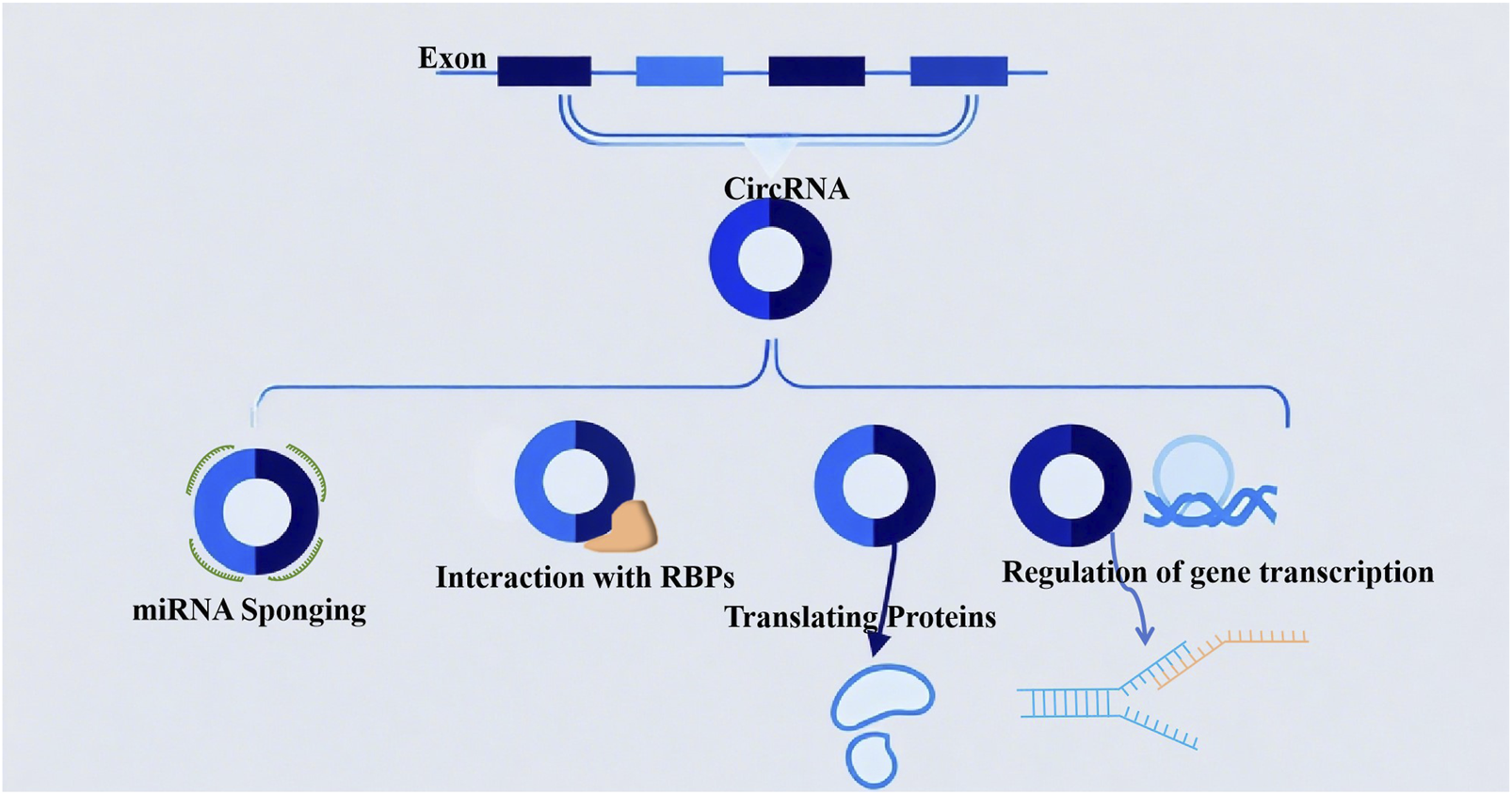 The biological functions of circular RNAs (circRNAs): (1) acting as miRNA sponges to sequester microRNAs; (2) modulating protein interactions through binding with RNA-binding proteins (RBPs); (3) possessing protein-coding potential; (4) participating in the regulation of gene transcription.
