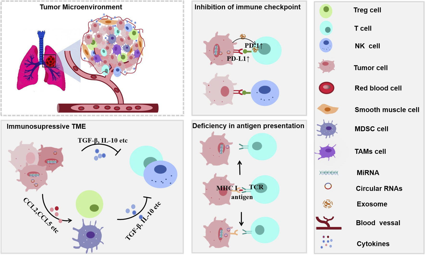 Mechanisms of immune evasion in lung cancer through an immunosuppressive tumor microenvironment (TIME). The immunosuppressive TIME facilitates immune escape via multiple pathway. Immunosuppressive cytokines such as TGF-β and IL-10 inhibit antitumor immunity. Upregulation of PD-L1 on tumor cells leads to checkpoint inhibition, while impaired antigen presentation is symbolized by the disrupted MHC I–TCR interaction. Multiple cell types contribute to the immunosuppressive milieu, further promoting tumor immune evasion.