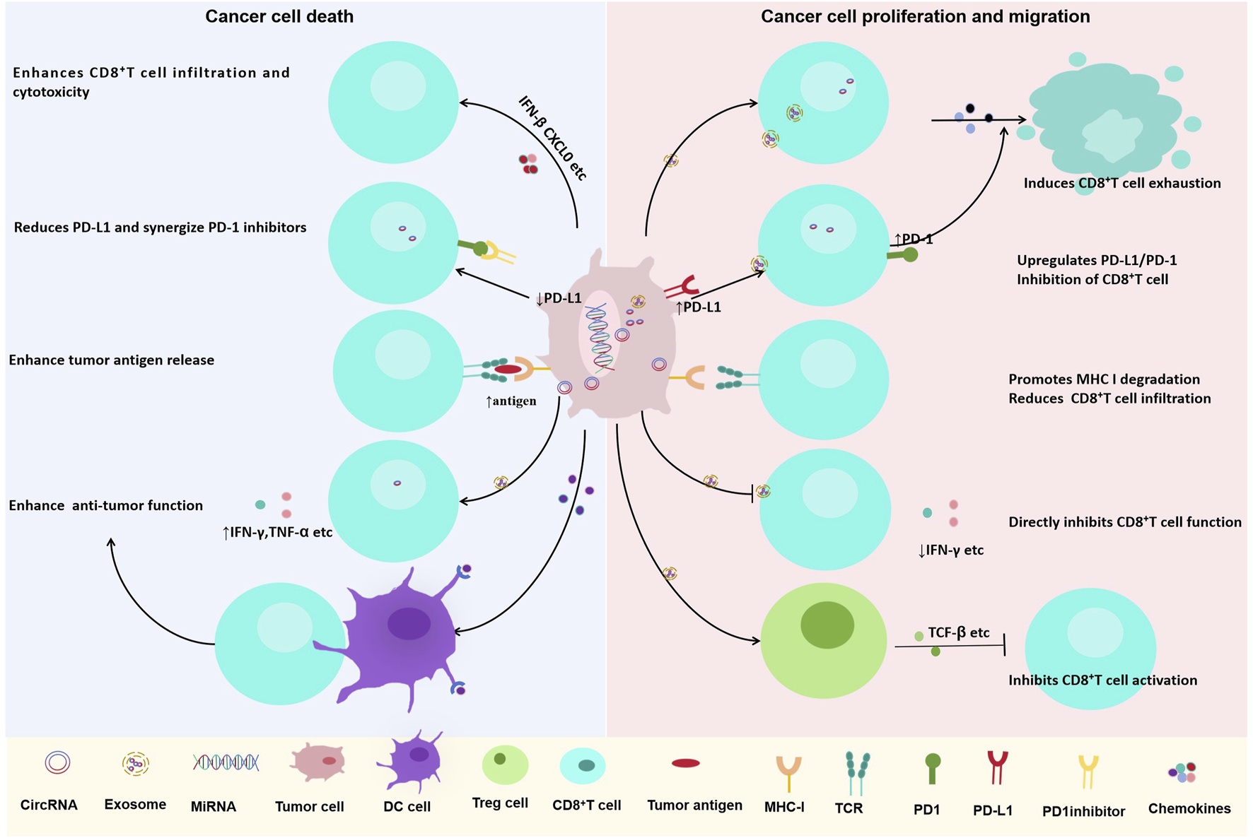 Dual roles of circRNAs in regulating CD8+ T cell-mediated anti-tumor immunity in lung cancer. CircRNAs play context-dependent roles in modulating CD8+ T cell function and tumor immune responses. (Left) Certain circRNAs enhance anti-tumor immunity by promoting CD8+ T cell infiltration and cytotoxicity, downregulating PD-L1 expression, increasing tumor antigen release, and enhancing IFN-γ and TNF-α production. (Right) Other circRNAs contribute to immune evasion by inducing CD8+ T cell exhaustion, upregulating PD-L1/PD-1 checkpoint expression, promoting MHC-I degradation, reducing CD8+ T cell infiltration, and directly inhibiting CD8+ T cell function through immunosuppressive cytokines such as TGF-β.