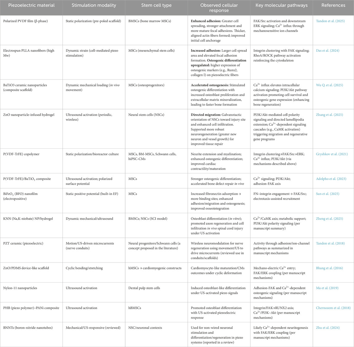 Table 1. Representative piezoelectric materials, stimulation modalities, stem cell types, cellular responses, and key signaling pathways are summarized in this review.