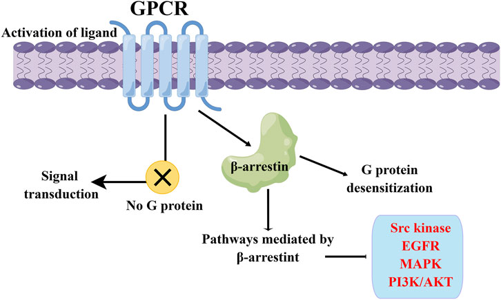 Figure 2. β-arrestin-mediated GPCR biased signaling pathway. The β-arrestin signaling pathway can induce desensitization of G proteins, and it can also mediate the transmission of various signaling pathways, including Src kinase, EGFR, MAPK, and PI3K/Akt.