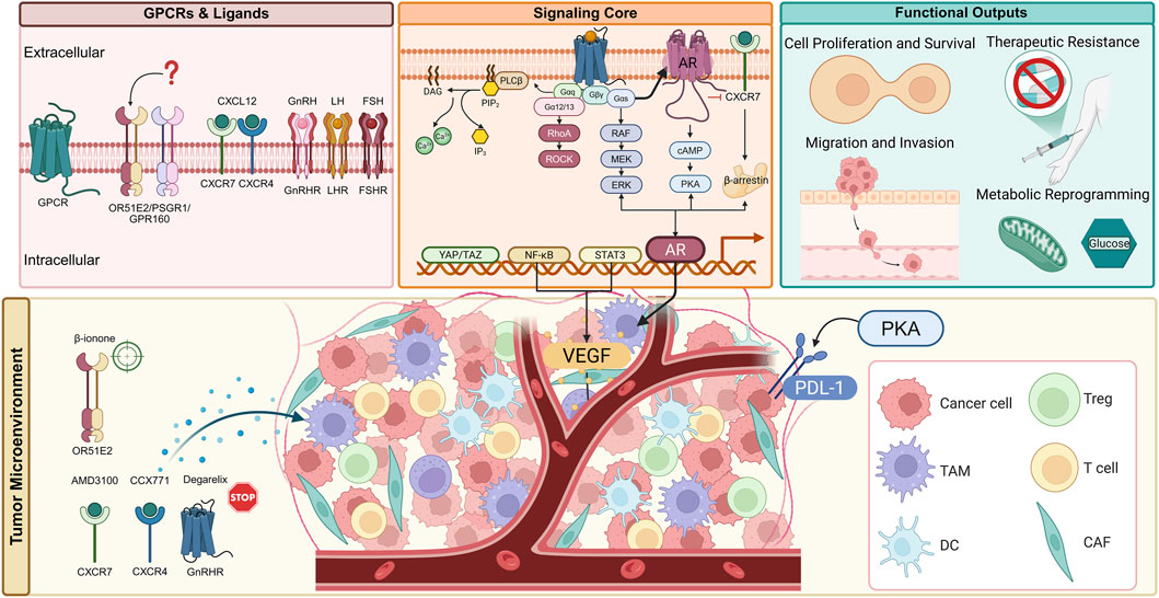 We propose a “GPCR–AR–TME” framework, linking the three GPCR subfamilies reviewed here to the hallmarks of PCa (Figure 3). Orphan receptors often drive proliferation; chemokine receptors are pivotal for metastasis, immune evasion, and therapy resistance; and hormone-responsive receptors can bypass classical androgen signaling, in part by stimulating intracrine androgen synthesis. This framework underscores how GPCRs serve as central nodes integrating signals from the tumor microenvironment, AR pathway, and intrinsic oncogenic drivers. Our synthesized framework is further supported by emerging insights. For instance, GPCR signaling can activate the Hippo-YAP/TAZ pathway, which cooperates with AR and other transcription factors to drive aggressive tumor phenotypes (Khalilimeybodi et al., 2023). The crosstalk between cancer cells and the TME is bidirectional; while GPCRs in cancer cells promote the recruitment of immunosuppressive cells and angiogenesis, signals from the TME continuously activate tumor GPCRs, creating a feed-forward loop (Wu et al., 2023; Williams et al., 2024; Li et al., 2025). Moreover, GPCR signaling can upregulate PD-L1 expression on tumor cells, directly linking it to immune checkpoint regulation (Khan et al., 2023; Topalian et al., 2023).