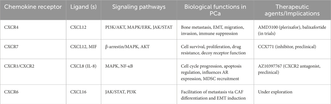 In 2006, Tobias et al. detected the expression of CXCL1, CXCL3, CXCL5 and CXCL6 in prostate cancer cell lines DU-145 and PC-3, but not in LNCaP (Engl et al., 2006). Further studies found that inhibition of CXCL8 and its receptor chemokines CXCR1 and CXCR2 promote G1 cell cycle arrest and apoptosis, suggesting that CXCR1 and CXCR2 inhibit tumor progression in prostate cancer by influencing cell proliferation. Meanwhile, by enhancing CXCR2 expression, AR expression was antagonistically regulated (Dahal et al., 2023). In androgen-independent prostate cancer (AIPC), co-administration of CXCR2 selective antagonist AZ10397767 attenuated oxaliplatin induced NF-κB activation, thus increasing oxaliplatin cytotoxicity and enhancing oxaliplatin induced apoptosis of AIPC cells (Wilson et al., 2008). In terms of tumor metastasis, CXCR6 signaling stimulated the transformation of mesenchymal stem cells into cancer-associated fibroblasts, which secreted stroma-derived factor 1, also known as CXCL12. CXCL12 expressed by cancer-associated fibroblasts then banded to CXCR4 on tumor cells and induced epithelial-mesenchymal transformation, ultimately promoting metastasis to secondary tumor sites (Jung et al., 2013). However, the research on the function of the above chemokine receptors is still weak and needs further exploration and discovery.