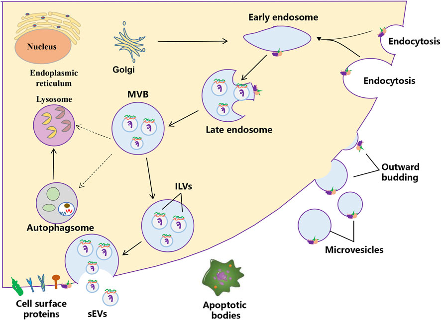 Figure 1. The biogenesis process of extracellular vesicles. Two mechanisms of EVs biogenesis are illustrated. The process of releasing sEVs into the extracellular milieu contains three distinct steps: sEVs biogenesis, intracellular trafficking of MVBs, and fusion of MVBs with the plasma membrane. Early endosomes are formed by the inward budding of the plasma membrane, or in some cases from the Golgi. Early endosomes mature into late endosomes and finally generate MVBs, in which process intraluminal vesicles (ILVs) are formed by inward invagination of the endosome limiting membrane. The fate of MVBs can be fusion with the plasma membrane, which results in the release of sEVs. Alternatively, MVBs can fuse with lysosomes/autophagosomes for degradation. Microvesicles arise from the direct outward budding and fission of the plasma membrane.