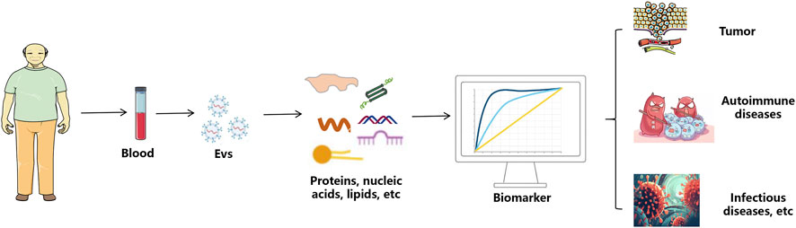 Liquid biopsy, an advanced technology for analyzing body fluid samples, is gaining traction in cancer diagnostics and monitoring. Blood-based liquid biopsy, particularly focusing on cell-free DNAs (cf-DNAs), circulating tumor cells (CTCs), and EVs, has garnered significant attention (Su et al., 2024). The benefits of analyzing EVs through liquid biopsy include: (1) EVs are found in higher concentrations in bodily fluids compared to circulating tumor cells; (2) EVs offer more detailed information about the cells that produce them than circulating DNA does; and (3) EVs exhibit strong biological stability even within the harsh tumor environment (Kalluri and LeBleu, 2020; Yu et al., 2022; Mathew et al., 2020). The potential of EVs in clinical diagnostics is vast, spanning across tumor detection, autoimmune diseases, and infectious diseases (Figure 2). Their non-invasive nature allows for the collection of biological fluids such as blood, urine, and saliva, making them ideal candidates for liquid biopsies. This section will explore the specific applications of EVs in identifying tumor markers, diagnosing autoimmune diseases early, and detecting biomarkers for infectious diseases.
