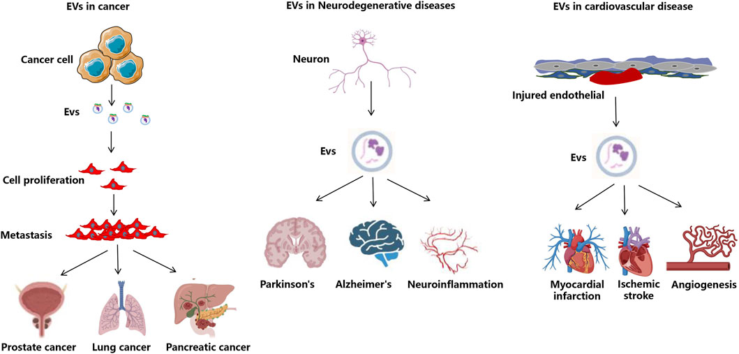 EVs are increasingly recognized for their potential in monitoring treatment efficacy across various medical fields, for example, tumors, neurodegenerative diseases, cardiovascular diseases, etc (Optical microscopy and transcriptomics reveal, 2024) (Figure 3). These vesicles, which are secreted by all cell types, contain a diverse array of biomolecules, making them valuable for real-time monitoring of therapeutic responses. Their presence in various bodily fluids, such as blood and urine, allows for non-invasive sampling, which is a significant advantage over traditional biopsy methods. Recent studies have demonstrated that EVs can serve as biomarkers for ongoing monitoring of treatment efficacy, particularly in cancer therapies. For instance, the dynamic changes in EV composition can reflect the biological status of tumors, providing insights into treatment responses and disease progression (Stevic et al., 2020). Moreover, the ability to analyze EVs can facilitate personalized medicine approaches, tailoring therapies based on individual patient responses.