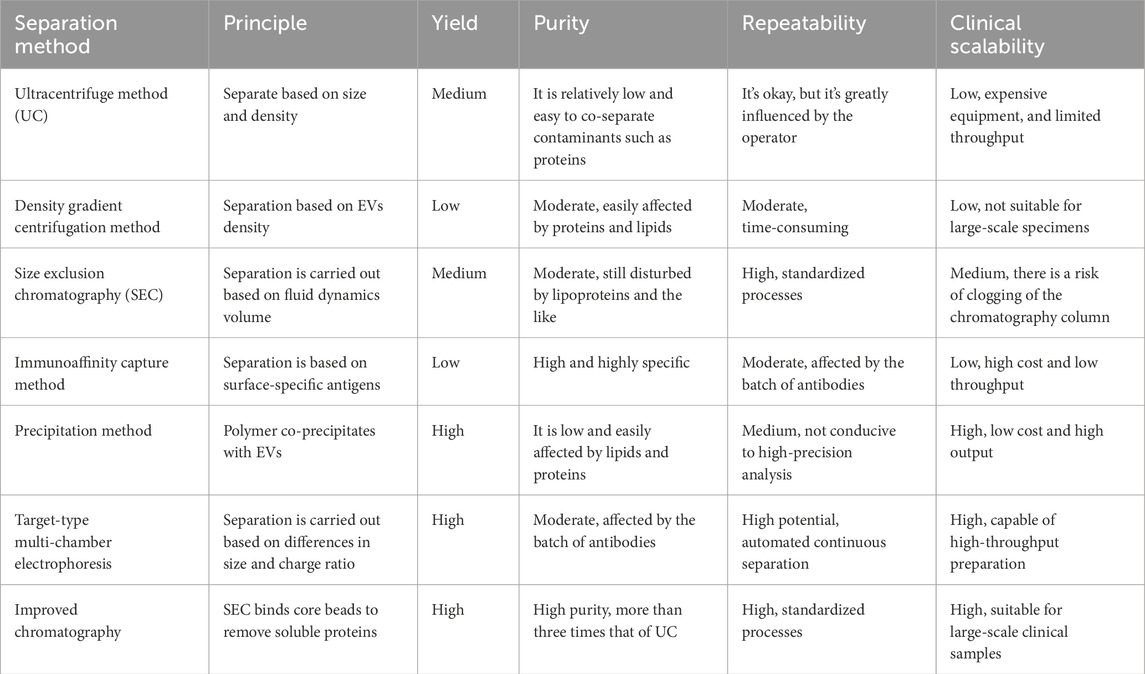Techniques for Isolation and Identification of Extracellular Vesicles. One of the foremost challenges in EVs research lies in the isolation and identification techniques employed. Current methods, such as ultracentrifugation and size exclusion chromatography, often yield heterogeneous populations of EVs, complicating downstream analyses and interpretations (Jia et al., 2022). The characteristics of currently widely used EVs separation methods are summarized in Table 1. The lack of standardized protocols results in variations in yield and purity, which can significantly affect the reproducibility of results across different laboratories (Royo et al., 2020). Furthermore, existing techniques may co-isolate non-EV components that can obscure the biological relevance of the findings. Emerging methods, such as microfluidic devices and immunoaffinity capture, show promise for enhancing specificity and efficiency in EV isolation (Arora et al., 2024). However, these methods are still in the developmental phase and require validation to ensure their applicability in clinical settings. The need for robust, reproducible, and standardized protocols is critical for advancing the field and facilitating the transition of EV research from bench to bedside.