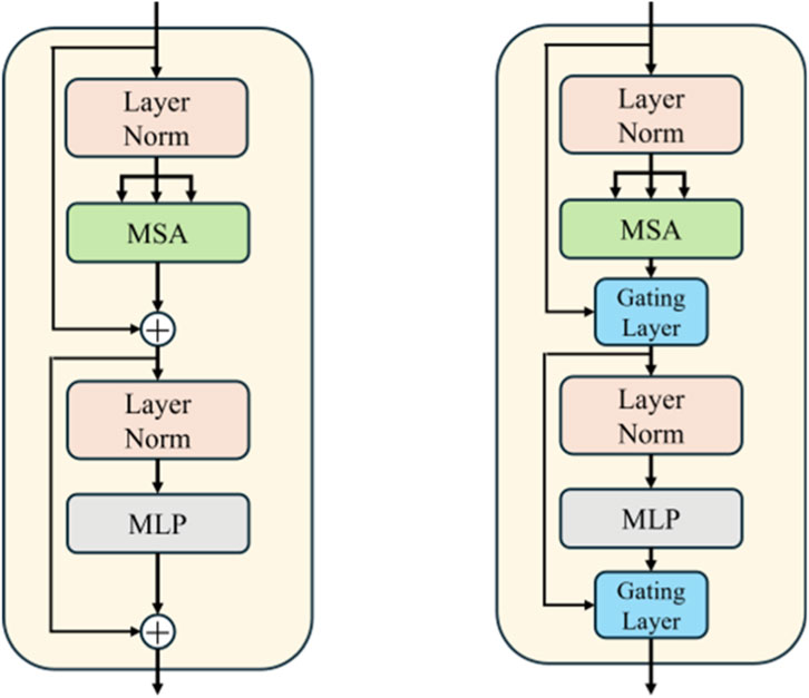 Figure 6. Gated residual learning diagram. The left structure is the original transformer layer, while the right structure is the transformer layer with gated residual learning.