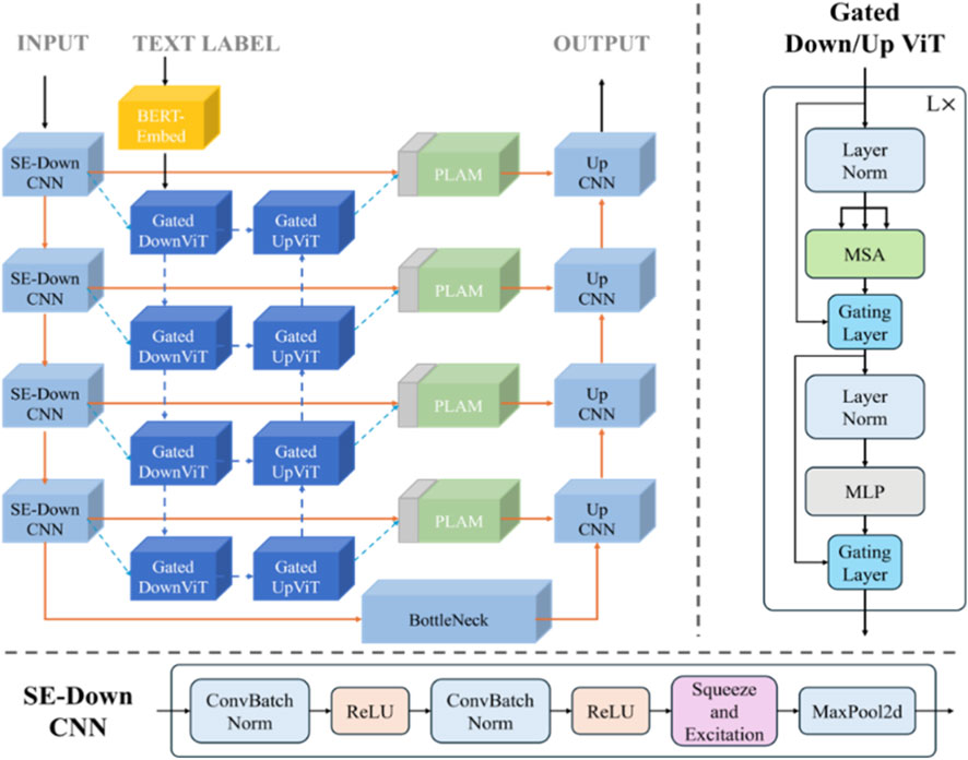 The LViT (Li et al., 2024) model consists of a U-shaped CNN branch and a U-shaped ViT branch. The CNN branch serves as the information input source, with its segmentation head generating the predicted masks. The ViT branch fuses image and textual information, leveraging the Transformer’s capability to process cross-modal data. Specifically, textual data is first simplified and vectorized, then combined with image vectors, which are passed into the U-shaped ViT branch for processing. Additionally, a Pixel-Level Attention Module (PLAM) is inserted at the skip connections in the U-shaped CNN branch, enabling LViT to maintain local image features while integrating more textual semantic information.