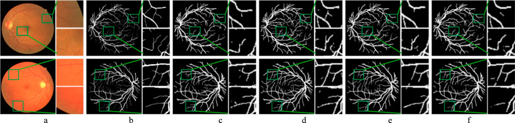 However, upon further inspection of the zoomed-in area, the proposed model shows fewer vessel discontinuities and clearer segmentation at the vessel endpoints. This improvement can be attributed to the integration of the SE module and gated residual learning, which enhances the model’s ability to capture subtle vessel features and maintain structural integrity. Specifically, the SE module strengthens the representation of critical vessel patterns, while the gated residual learning facilitates more effective information flow, enabling the model to better handle challenging cases such as fine vessel endpoints and complex bifurcations. These advantages highlight the proposed model’s superior performance in preserving vessel continuity and accurately segmenting intricate vessels.
