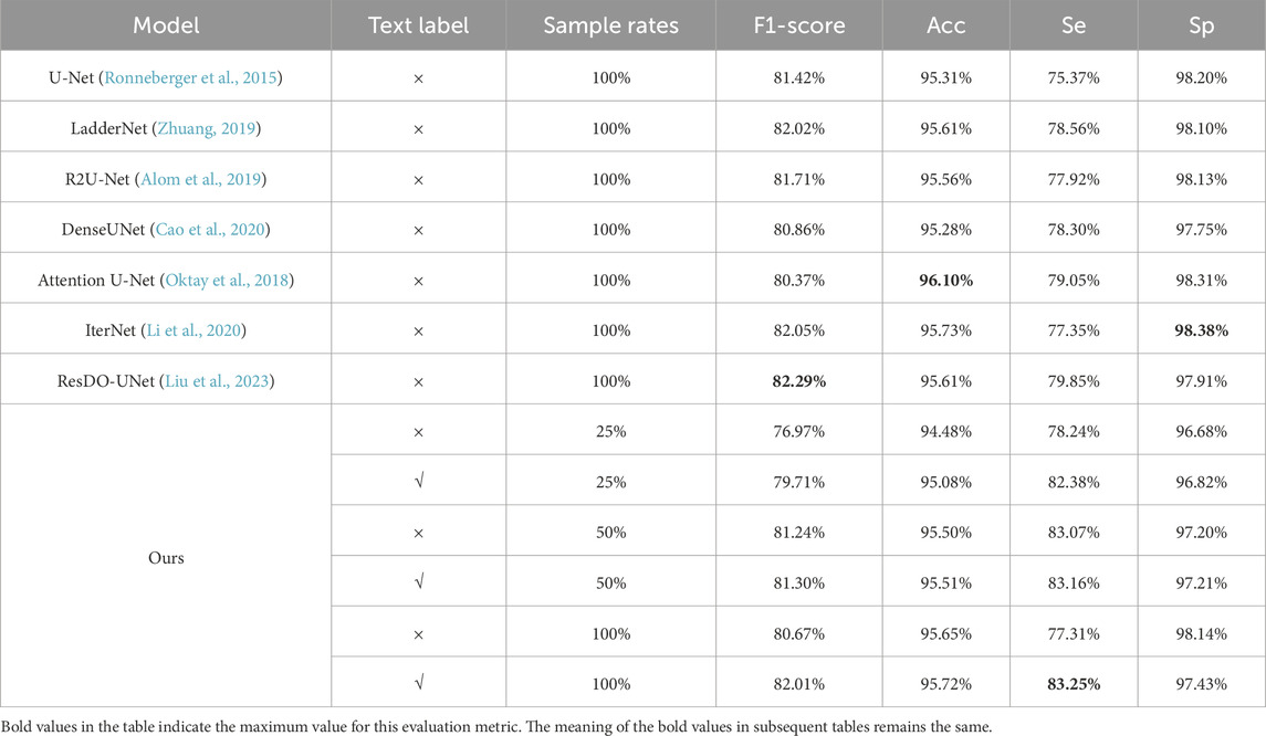 Overall, the advantage of the proposed model lies not only in a single metric but in achieving a balanced improvement across multiple key evaluation metrics. Especially under low sample rate conditions, the introduction of text labels significantly enhances the accuracy of vessel segmentation. Moreover, the proposed model demonstrates strong competitiveness in both ACC and Se, effectively improving the accuracy and robustness of the segmentation results.