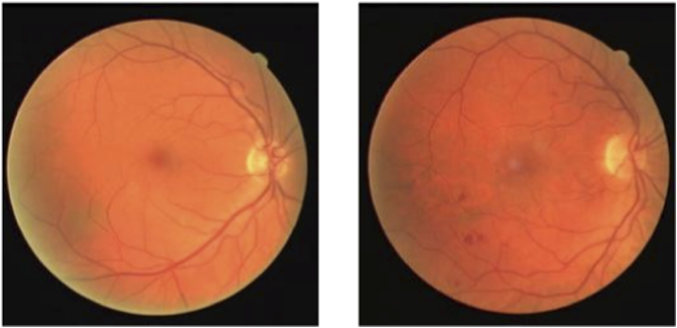 With the rapid development of medical imaging technology and equipment, computer-aided medical image analysis has become increasingly important in clinical diagnosis and surgical planning (Tian et al., 2021). Among these, medical image segmentation technology plays a key role in effectively extracting the morphology and spatial information of target areas, which is essential for quantitative analysis (Pham et al., 2000). Color fundus (CF) photography is a commonly used technique for capturing fundus images. A normal CF image is shown in Figure 1(left), which primarily includes the macula, optic disc, retina, and central fundus arteries and veins. In contrast, fundus images of diabetic patients, as shown in Figure 1(right), may exhibit abnormal vessel end-stage bleeding, where unclear boundaries and irregular dark red areas appear (Grinsven et al., 2016). Patients with hypertension and coronary heart disease may show fundus arterial sclerosis, while glaucoma patients may exhibit vessel changes in the optic disc (Dervisevic et al., 2016). Therefore, accurate segmentation of vessels in CF images is of great importance in assisting the early diagnosis of related diseases.