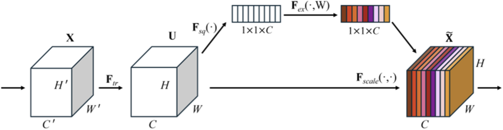 The SE module (Hu et al., 2020) is a channel attention mechanism that adaptively weights feature channels through three key steps: Squeeze, Excitation, and Recalibration. These steps dynamically adjust the responses of each channel in the feature maps, enabling the network to focus more on channels that contribute to the task while suppressing irrelevant ones. The process of the SE module is illustrated in Figure 4.