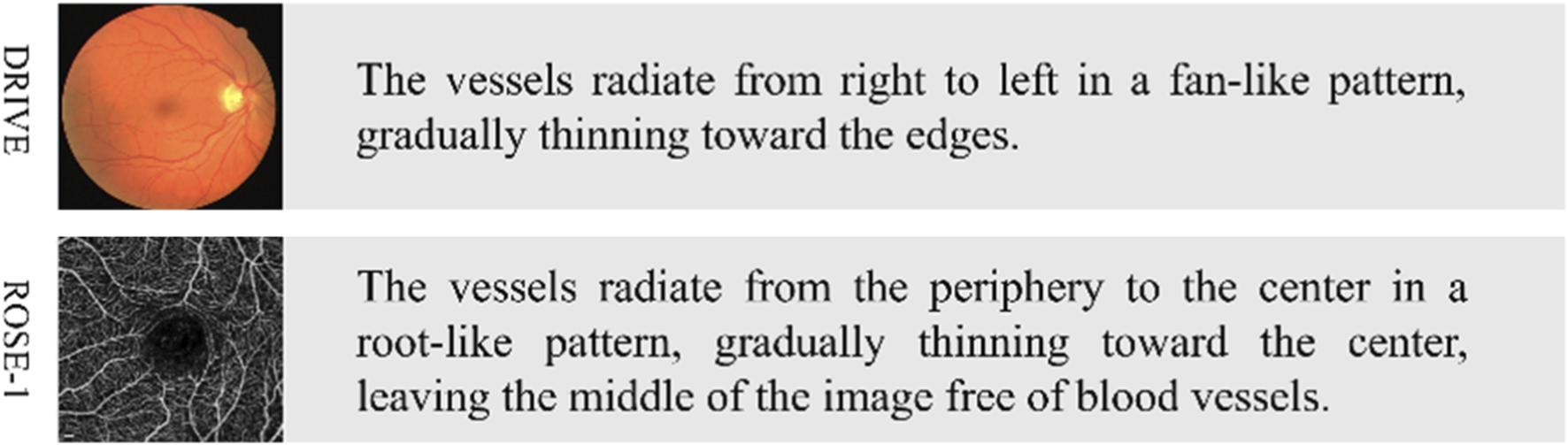 Through the above process, we have established text labels corresponding to the images from the DRIVE and ROSE-1 datasets, laying the foundation for subsequent exploration of the performance of the proposed model. Specific examples are illustrated in Figure 7.