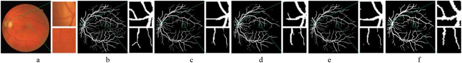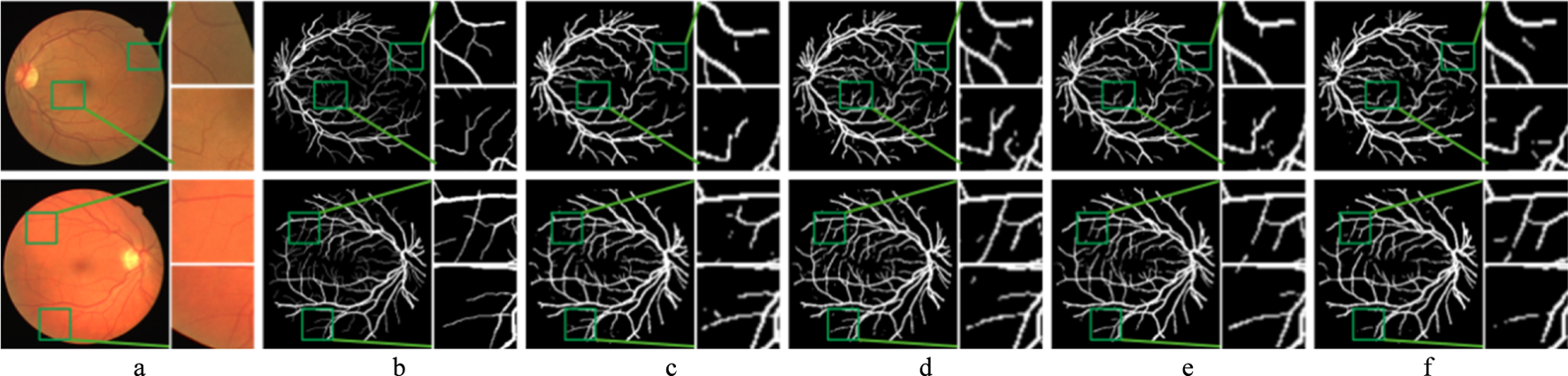 Figure 10. Comparison of segmentation results of different models. (a) CF image. (b) Ground truth. (c) U-Net. (d) R2U-Net. (e) Attention U-Net. (f) Ours.