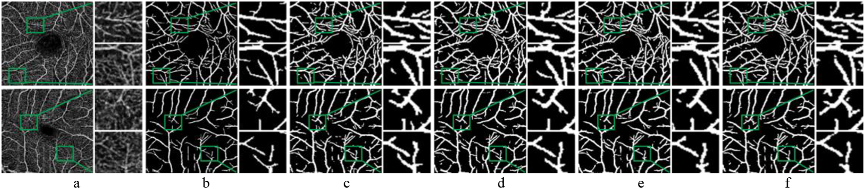 Figure 12. Comparison of segmentation results of different models. (a) OCTA image. (b) Ground truth. (c) U-Net. (d) CE-Net. (e) CS-Net. (f) Ours.