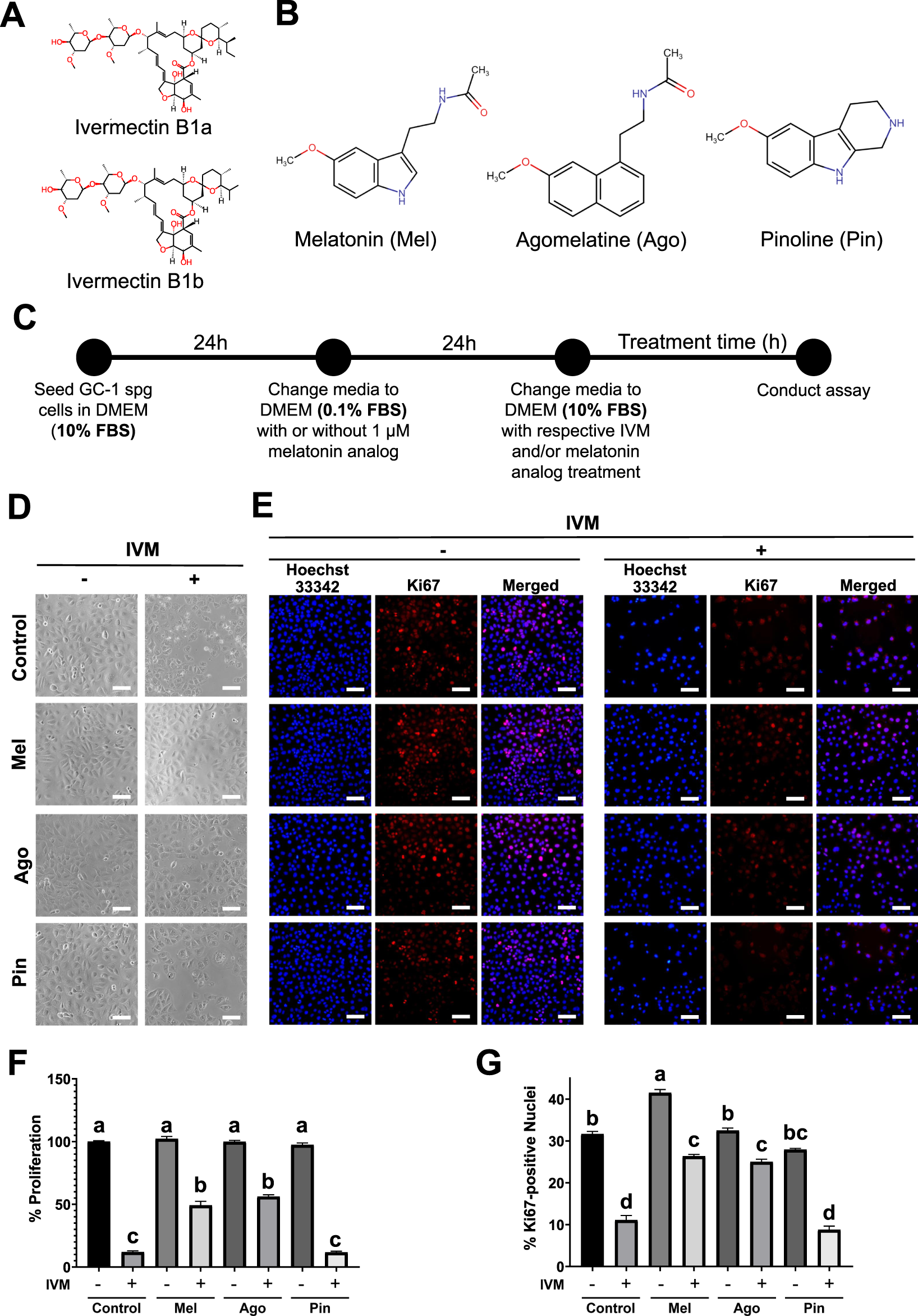 Effects of melatonin and agomelatine on proliferation loss in GC-1 spermatogonia (spg) treated with ivermectin (IVM) for 24 h (A) Chemical structure of IVM isomers. (B) Chemical structures of melatonin and its analogs, agomelatine and pinoline. (C) Schematic overview of the cell culture and experimental design. (D) Brightfield microscopy images showing cytoplasmic morphology. (E) Immunofluorescence images of Ki67 nuclear translocation. (F) Quantification of relative cell proliferation (n = 3). (G) Quantification of Ki67-positive nuclei (n = 3) in GC-1 spg treated with either control, melatonin, agomelatine, or pinoline with or without 16 μM IVM. IVM treatment conditions are denoted as positive (+) or negative (−). Scale bars: 100 µm. Data are presented as means ± SEM. Significant differences are indicated by different letters (a–d) at p < 0.05.