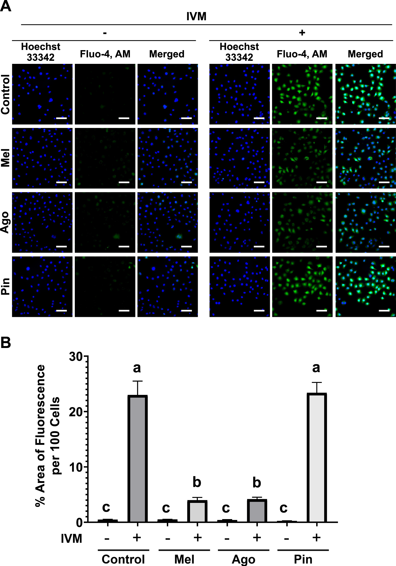 Melatonin and agomelatine inhibit cytoplasmic Ca2+ accumulation in GC-1 spermatogonia (spg) treated with ivermectin (IVM) for 3 h (A) Fluorescence microscopy images of GC-1 spg cells labeled with Fluo-4, AM. (B) Semi-quantification of Fluo-4, AM fluorescence intensity in GC-1 spg treated with either control, melatonin, agomelatine, or pinoline with or without 16 μM IVM (n = 5). IVM treatment conditions are denoted as positive (+) or negative (−). Scale bars: 100 µm. Data are presented as means ± SEM. Significant differences are denoted by different letters (a–c) at p < 0.05. Mel, melatonin; Ago, agomelatine; Pin, pinoline.